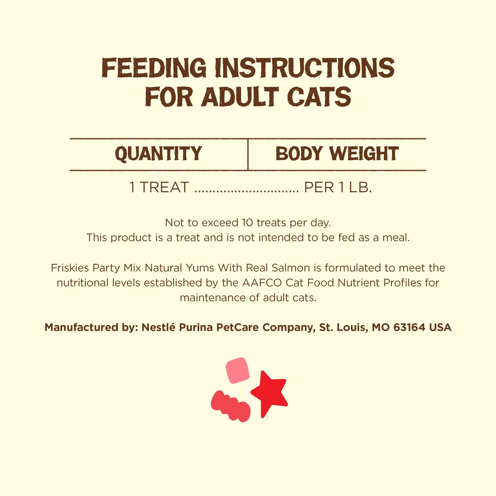 Details: Celebrate all of life's little moments with your cat when you offer Purina Friskies Party Mix Natural Yums With Real Salmon With Added Vitamins, Minerals and Nutrients adult cat treats. Made with real fish as the number 1 ingredient, these wholesome treats for adult cats give your feline friend the mouthwatering seafood taste she wants. Serve these crunchy cat treats as a cat snack to get her purring between meals, or include a few Purina cat treats along with her dinner to show your cat just how much she means to you. Fun shapes pique her interest as she crunches away at these yummy Friskies cat treats, which contain no artificial colors, flavors or preservatives. Tear open a cat pouch of Purina Friskies Party Mix Natural Yums With Real Salmon adult cat dental treats to delight your precious pet with tasty flavor and high-quality ingredients.