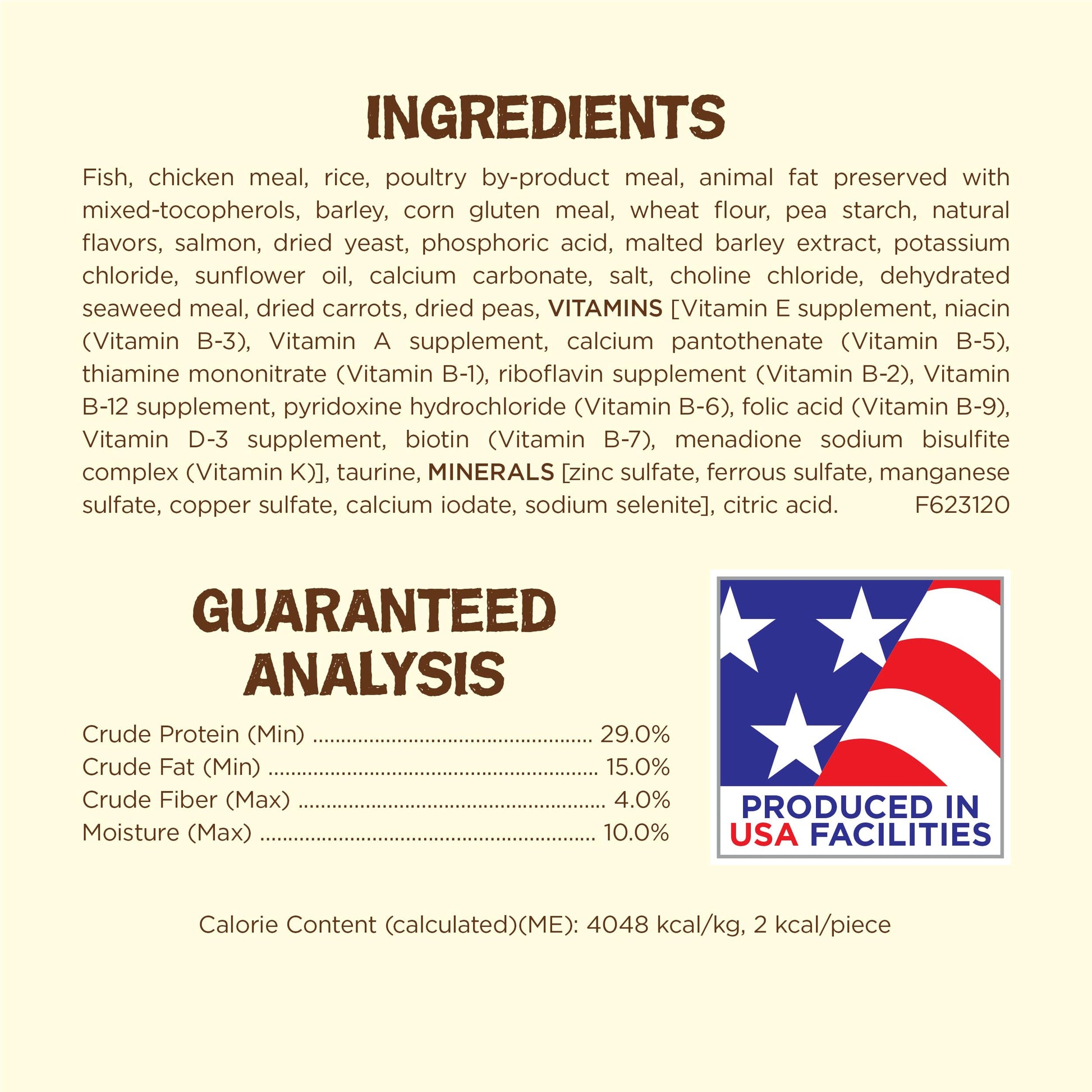 • Our crunchy cat treats designed for adult cats are made with no artificial colors, flavors or preservatives