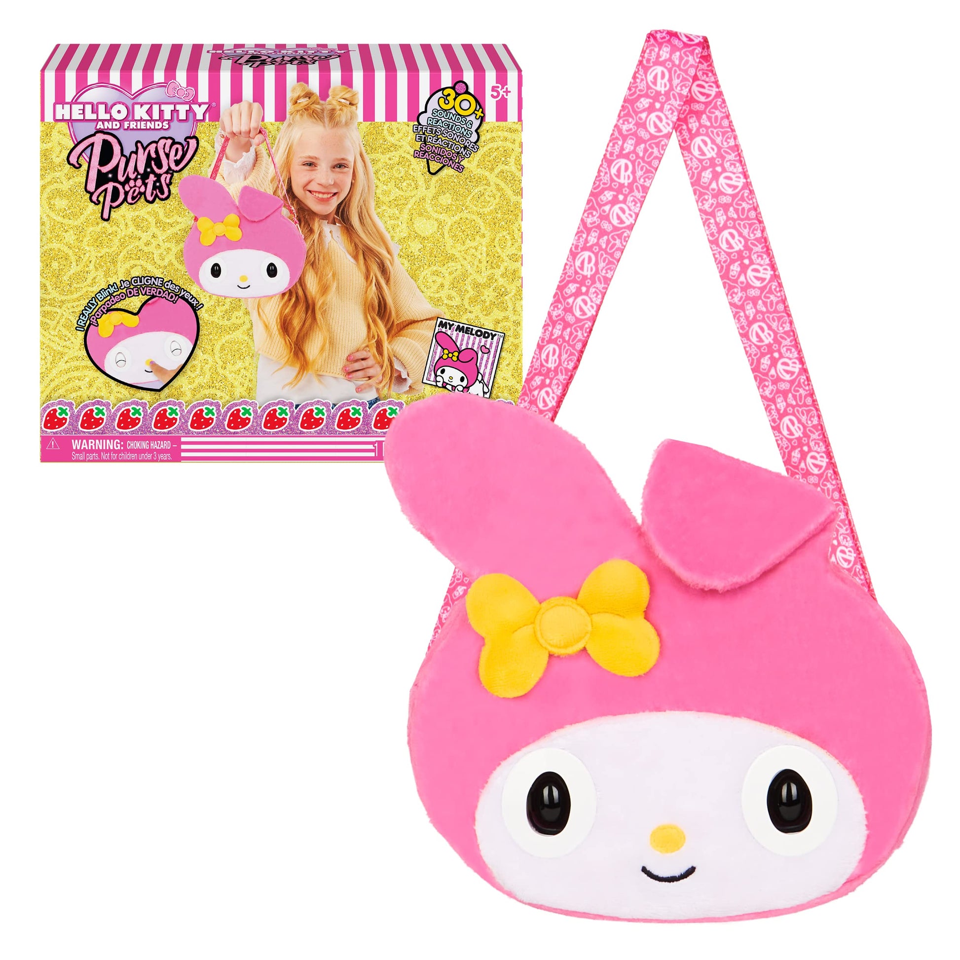 INTERACTIVE PET AND HELLO KITTY PURSE: This My Melody kids purse features her signature pink fleece hoodie, a yellow bow, floppy ears and an adjustable printed strap – the 42 in. length is perfect for Sanrio fans of all ages!