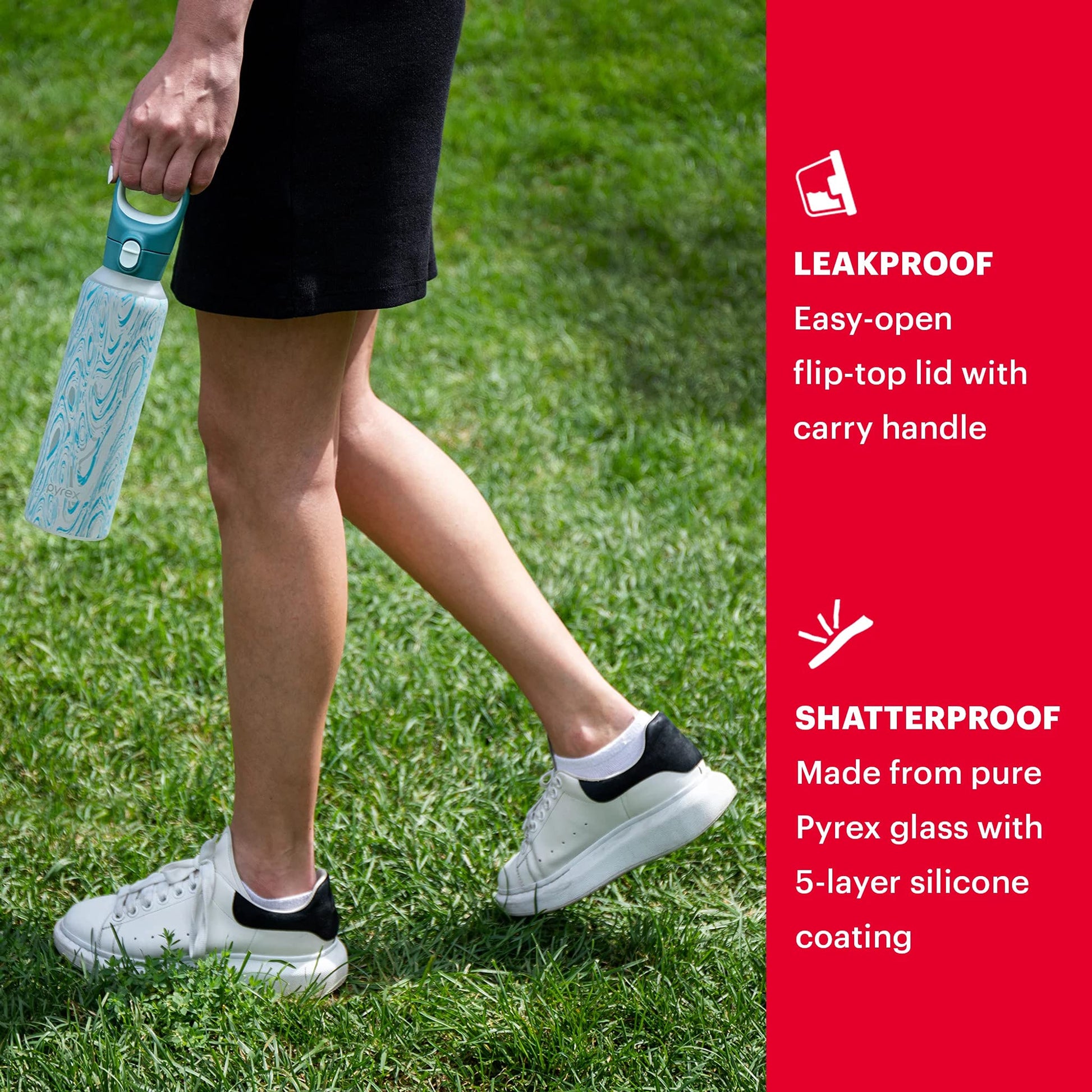 • ON-THE-GO: This Pyrex water bottle is ready for any occasion. Whether you're commuting, working out or simply taking a walk, this bottle is there to assist with its leakproof lid and handy carry handle for easy drinking throughout your day.