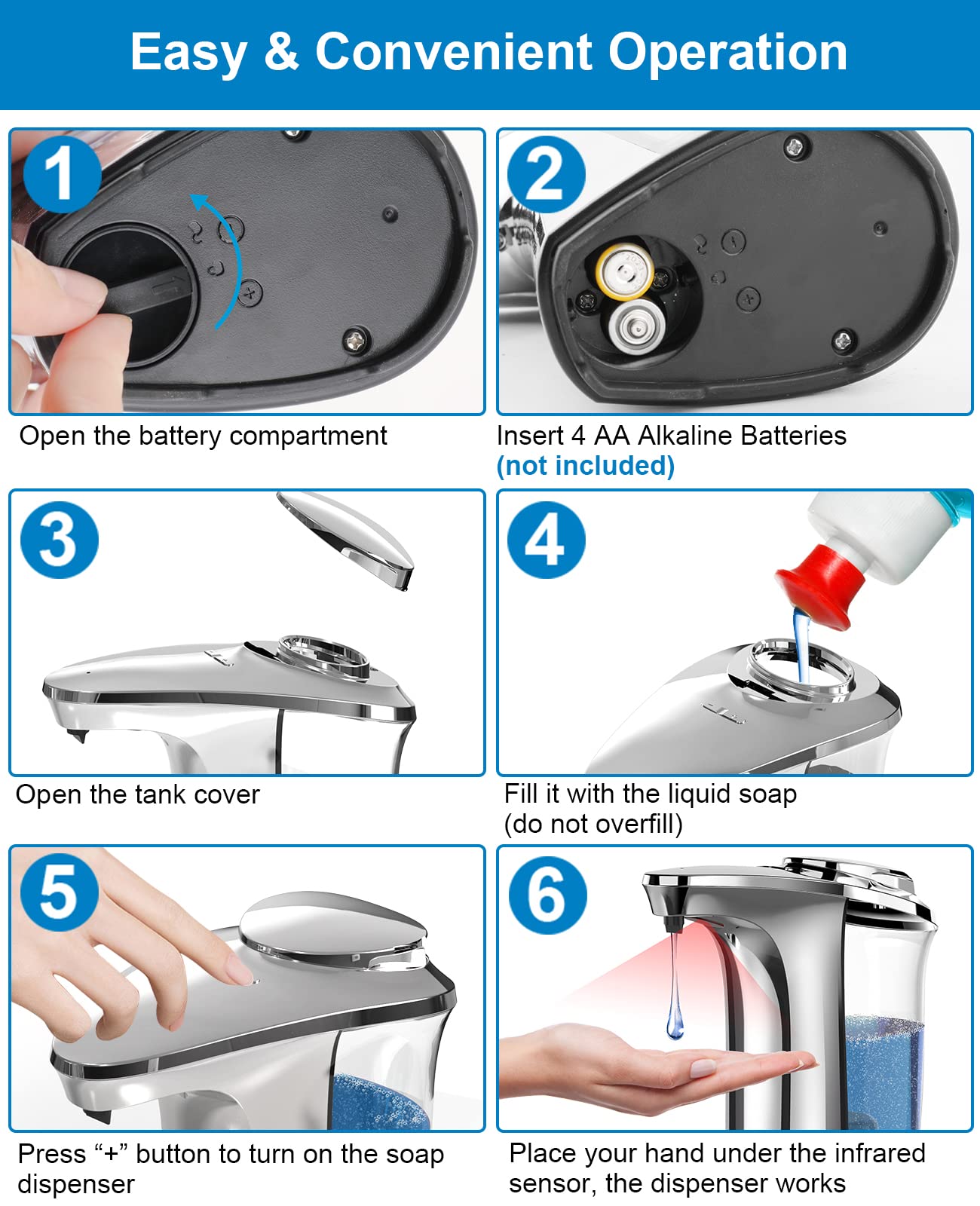 • [Wide Compatibility Soap Dispenser] This touchless soap dispenser operates on 4 AA Alkaline batteries (not included), which can be used in any occasion without limits on the power outlet. Suitable for multiple occasions, such as home, hotel, school, office, and other places. We will provide 2-year quality assurance and lifetime professional service, please reach out to us if any help is in need.