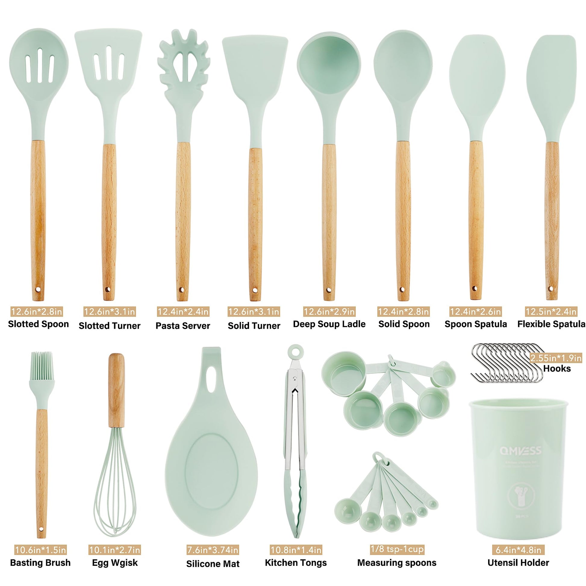 QMVESS Silicone Kitchen Utensils Set, 35 Pcs Non-Stick Cooking Utensils Set, Sturdy Insulation Wooden Handle Kitchen Accessories for Cooking with Spatula Set and Spoons Set Gadgets (Light Green)