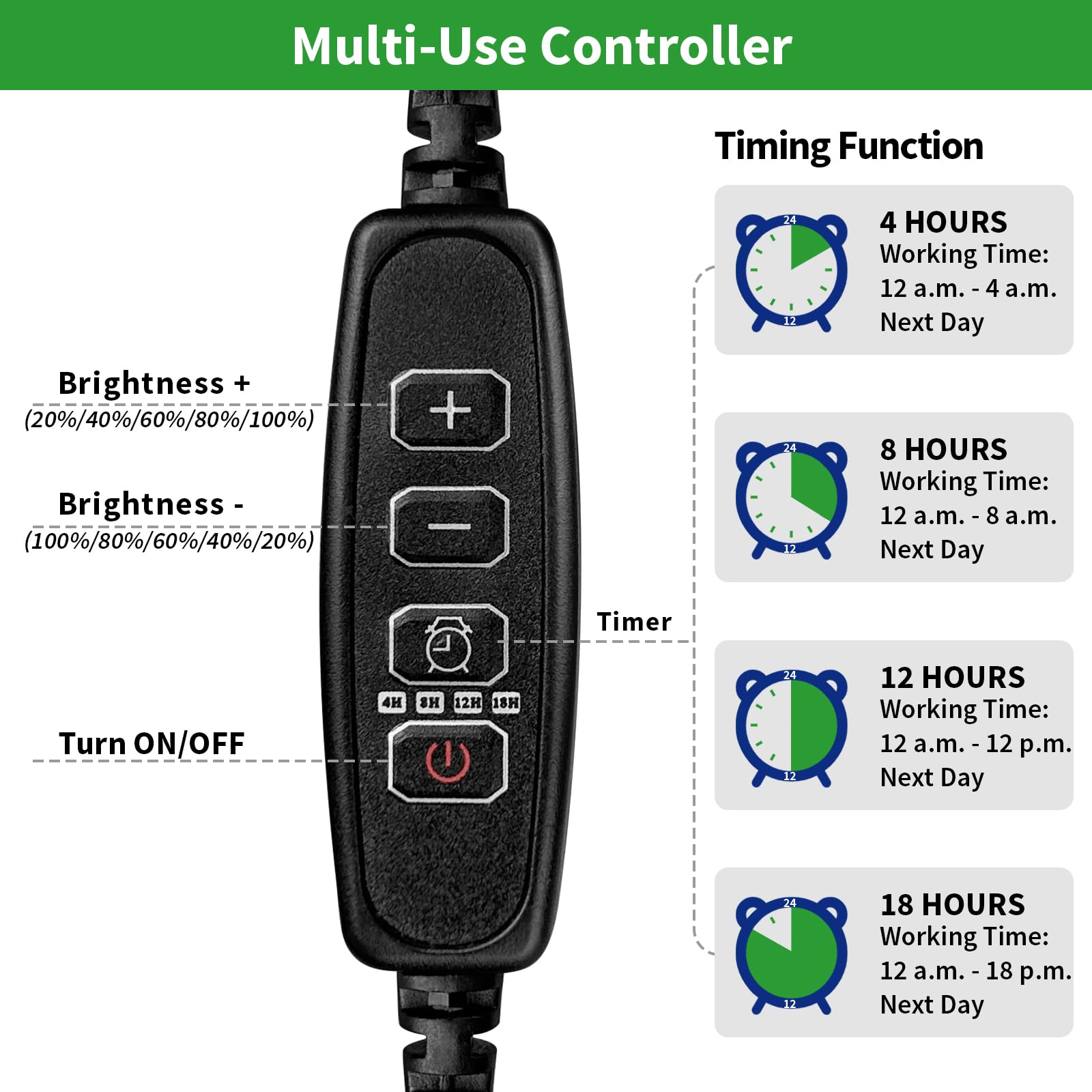 • 4-Level Timing Settings and 5-Level Brightness: Our seed starting trays offer customizable lighting schedules with options for 4, 8, 12, and 18-hour cycles, ensuring that your plants receive the appropriate amount of light at different stages of their growth. Additionally, the 5-level brightness control allows you to adjust the light intensity to meet specific plant light requirements.