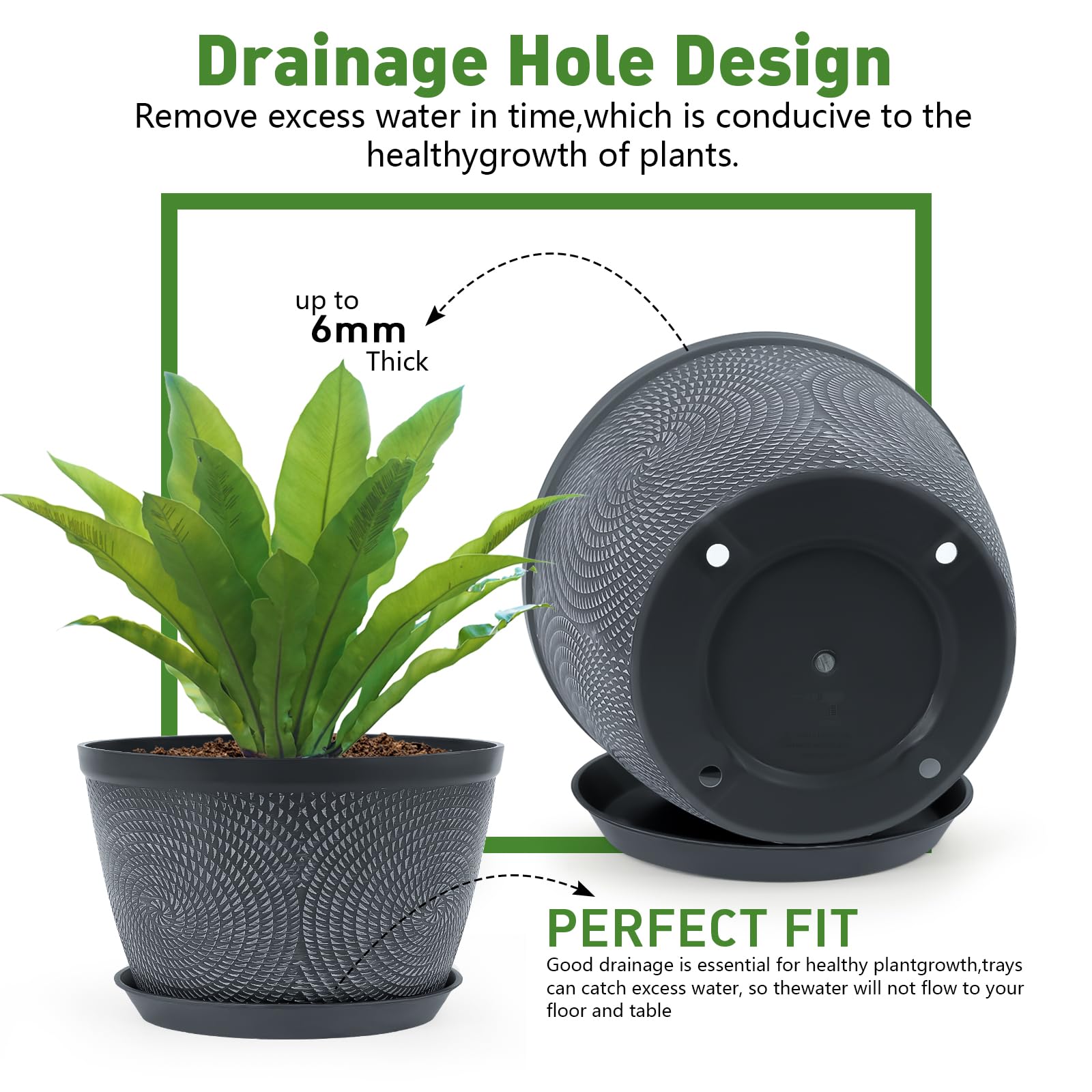 • 【Excellent Drainage and Tray】These lightweight plastic flower pots come with multiple drainage holes in the bottom to let exceed water easily flow out to help prolong the life of your plants, and the saucers are provided to hold just the right amount of water. Our classic 3 packs of 10 inch plant pot could create a healthy living environment for your plants.