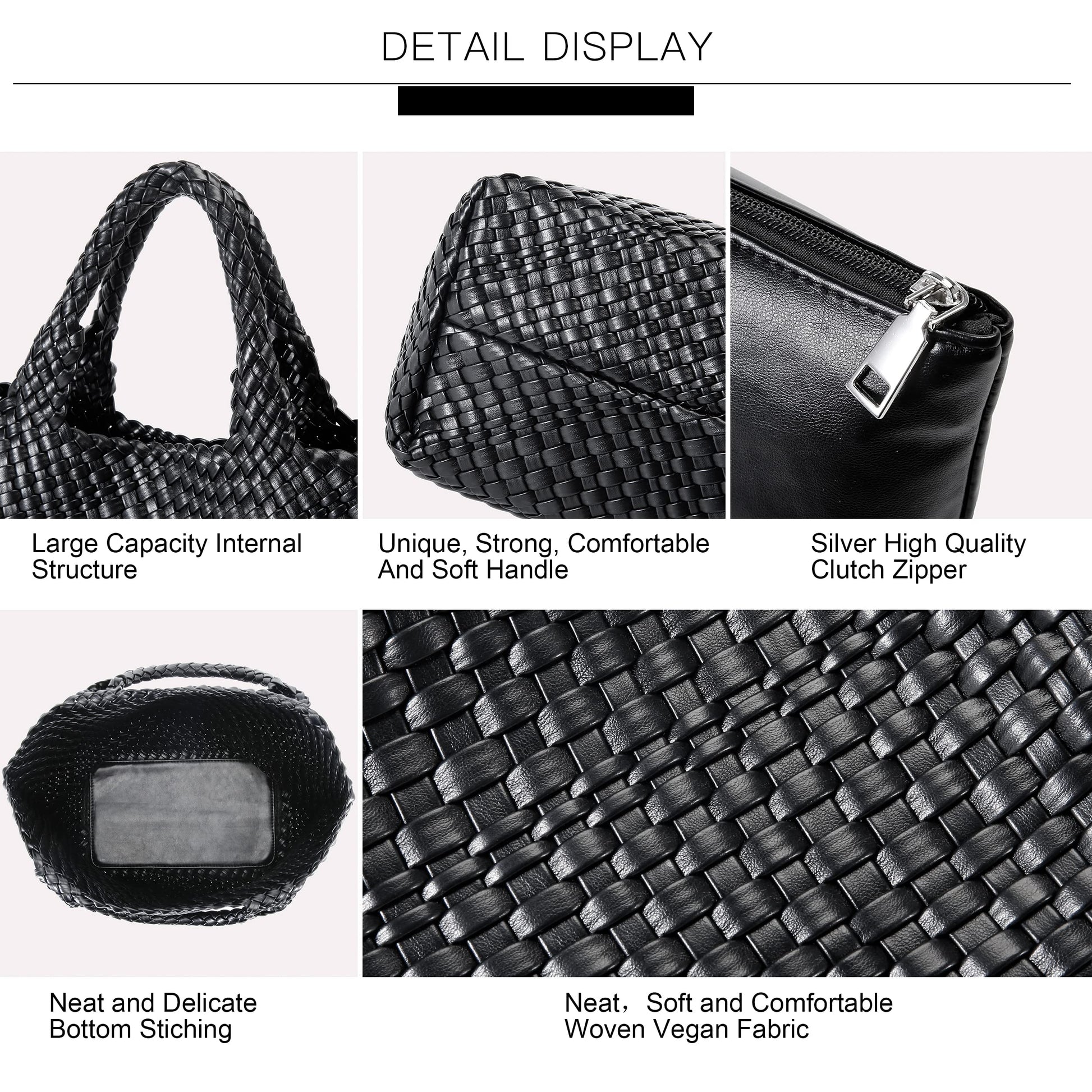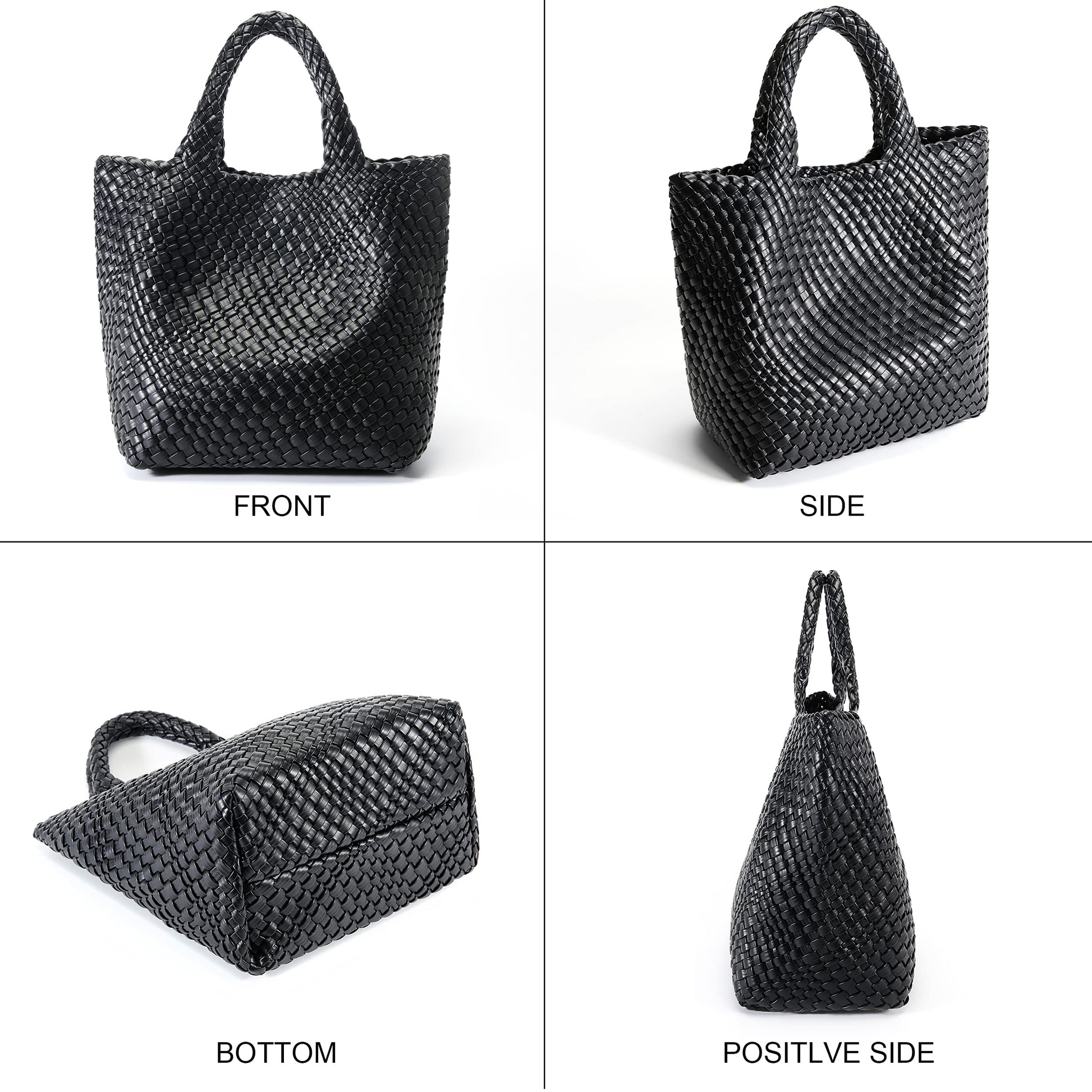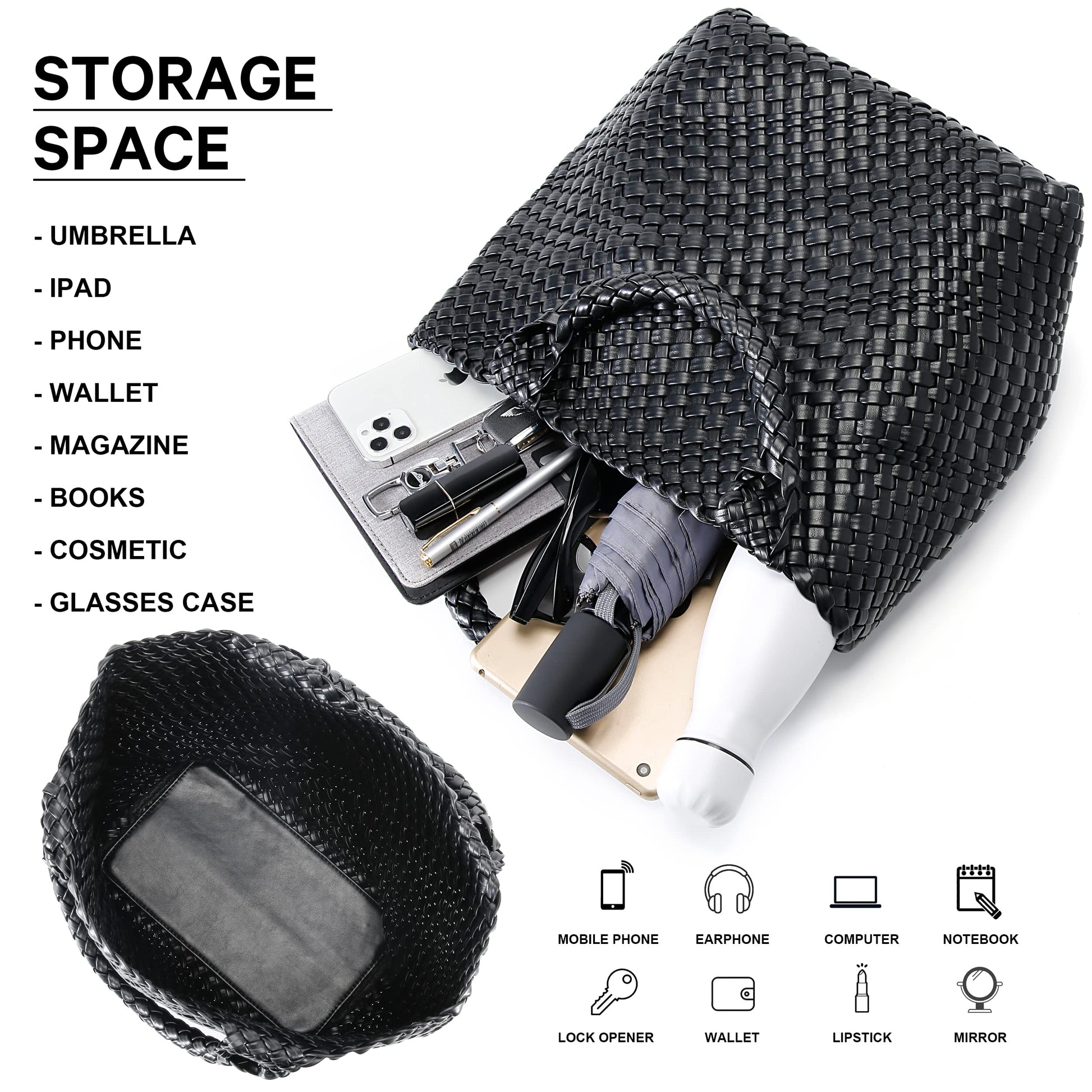 Queenoris Woven Bag for Women, Vegan Leather Tote Bag Large Summer Beach Travel Handbag and Purse Retro Handmade Shoulder Bag (Black)