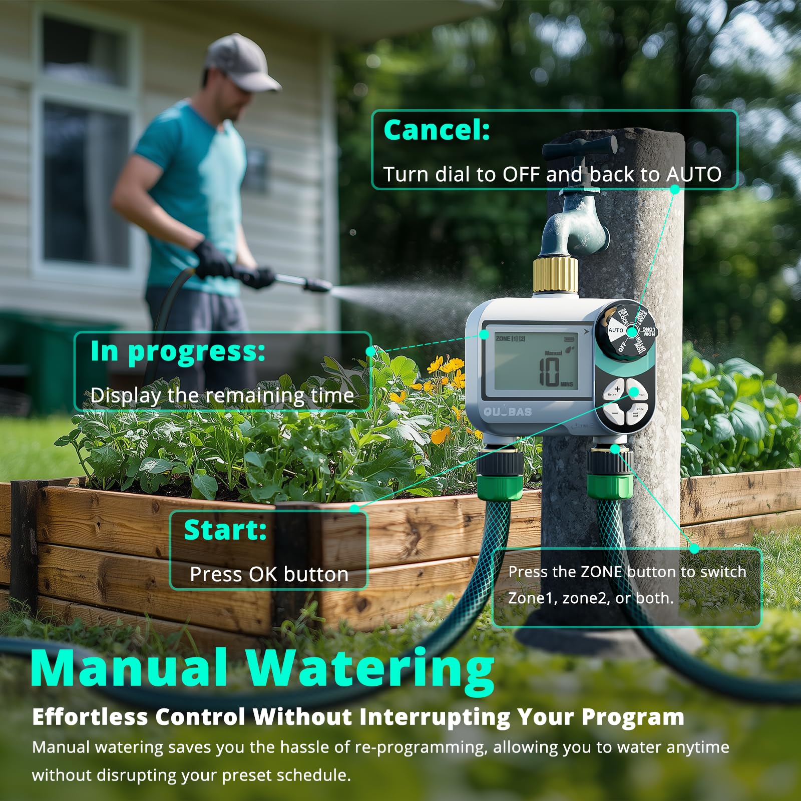 • Dual-Zone Control for Efficient Watering: Optimize your watering routine with this irrigation controller 2 zone for watering, designed with 2 independent zones for precise and targeted irrigation. Whether you’re watering different plant types or managing multiple garden areas, this feature allows you to customize watering schedules for each zone, saving water and ensuring optimal plant health.