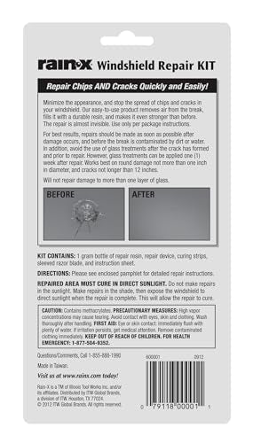 Details: Rain-X Car Windshield Repair Kit helps you minimize the appearance and stop the spread of chips and cracks in your windshield, helping you save time and money, avoiding a full windshield replacement. Rain-X Windshield Repair Kit is easy to use, and only takes minutes to apply. It removes air from the break, fills it with durable resin and makes it even stronger than before. For best results, repairs should be made as soon as possible after the damage occurs and before the break is contaminated by dirt or water. In addition, avoid the use of glass treatments after the crack has formed and prior to repair. However, glass treatments can be applied one (1) week after repair. The kit works best on round damage not more than one inch in diameter, and cracks not longer than 12 inches. It will not repair damage to more than one layer of glass. Pro-tip to avoid poor results - refrain from applying resin too quickly, air pockets forming during the application or repairing a contaminated crack as this may compromise your results.