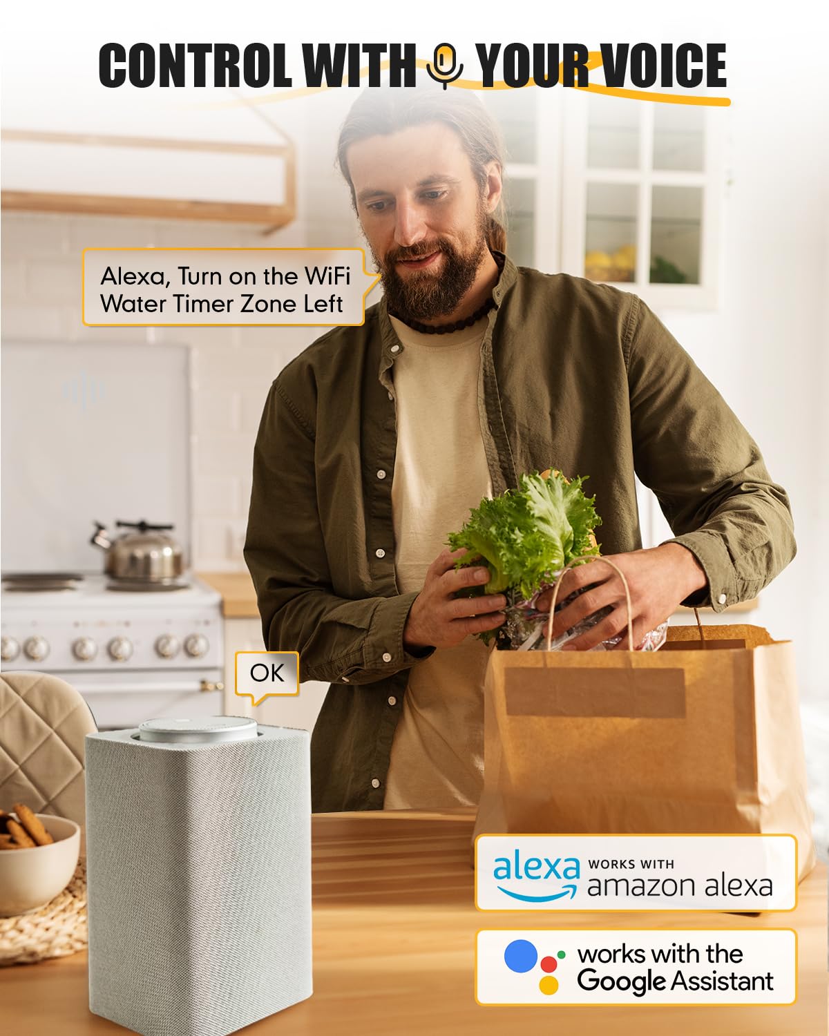 • Flexible Manual Watering:The manual watering time for each zone can be set from 1~59 minutes, and you can enable manual watering for the left/right/two zones via the APP, the button on the water timer, or voice commands to Alexa/Google Assistant.