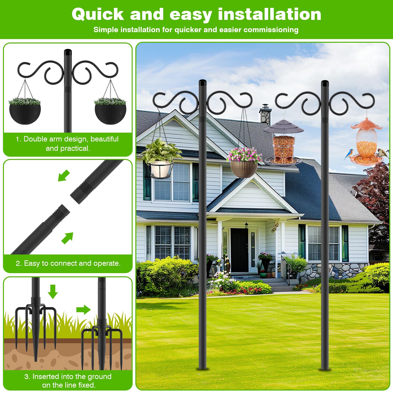 • 【DOUBLE ARM DESIGN】: The double hook hooks on the top allow feeders, baskets and bird feeders to be hung in different combinations to create a unique outdoor landscape. This variety not only beautifies the outdoor space, but also adds to the viewing pleasure.