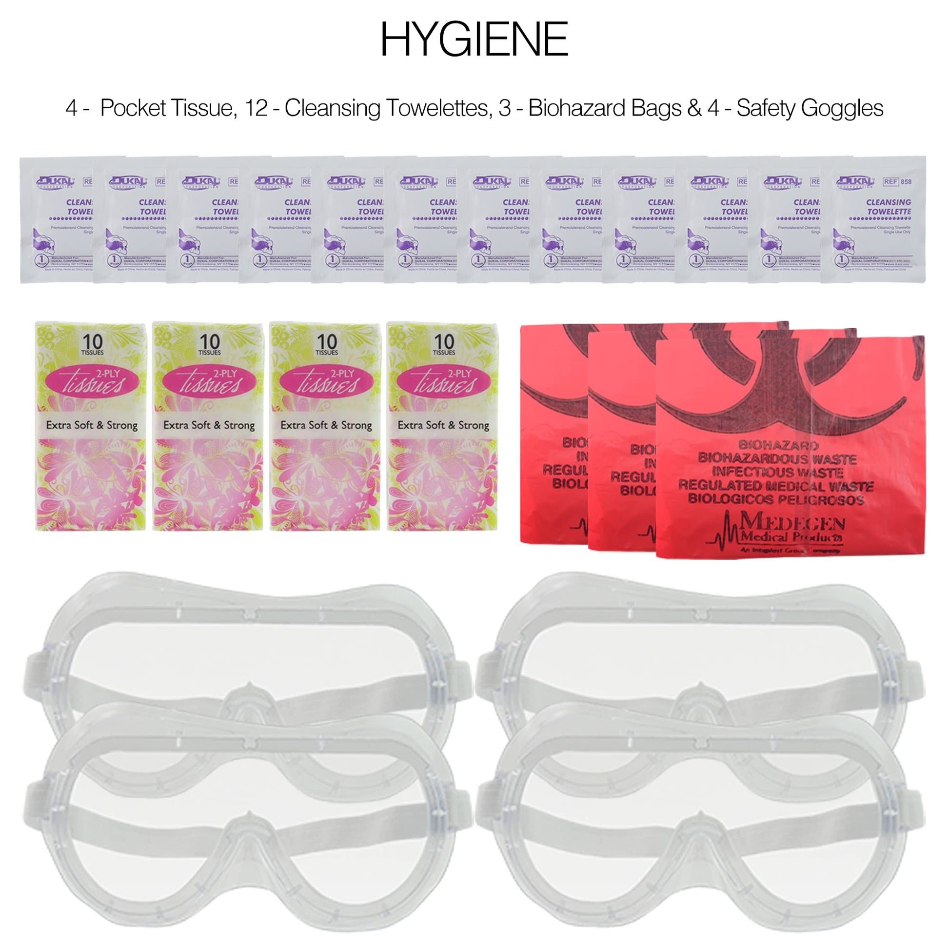 The Deluxe Emergency kit contains enough emergency supplies to sustain 4 people for three days, as recommended by the American Red Cross. Each kit includes 4 water boxes, food supply, 4 emergency ponchos, 4 survival blankets, 4 12-hour lightsticks, 4 pair nitrile gloves,4 dust masks, pocket tissues, emergency whistle, leather gloves, Multi-Tool, 10yds. Duct Tape, 4 pair goggles, 3 bio-hazard bags, premoistened towlettes, emergency communication plan/contacts, first aid kit that has 107 pieces, Emergency power station 4-function (flashlight, AM/FM radio, siren, cell phone charger) and a backpack. The kit, in a handy backpack, can be stored at home, at school, and at the office.