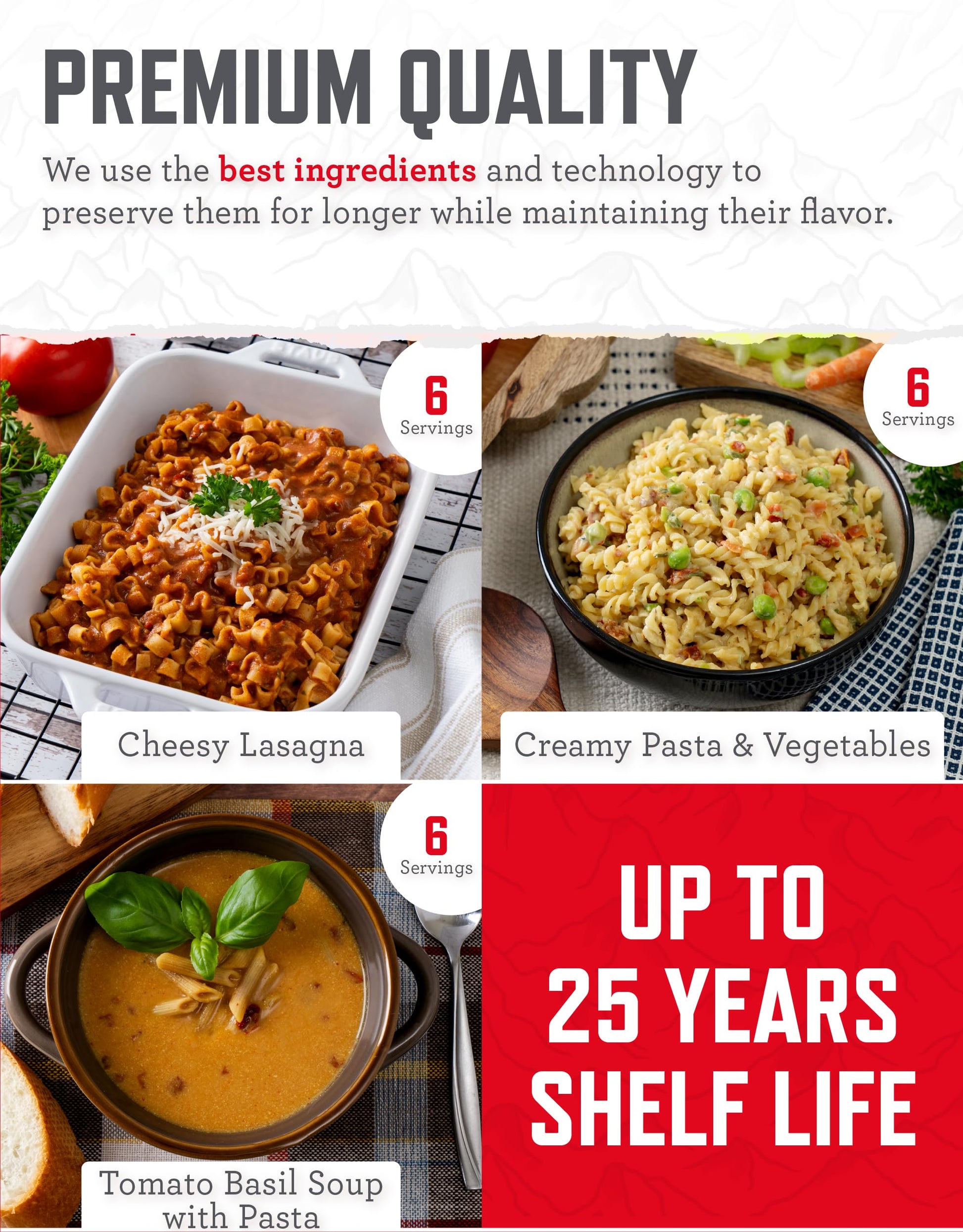 • NUTRITIOUS MEALS: Our survival food kit offers not only convenience but also tasty, nutrient rich entrées options like Creamy Pasta & Vegetables, Cheesy Lasagna, and Tomato Basil Soup with Pasta to enhance your outdoor meals reliably.