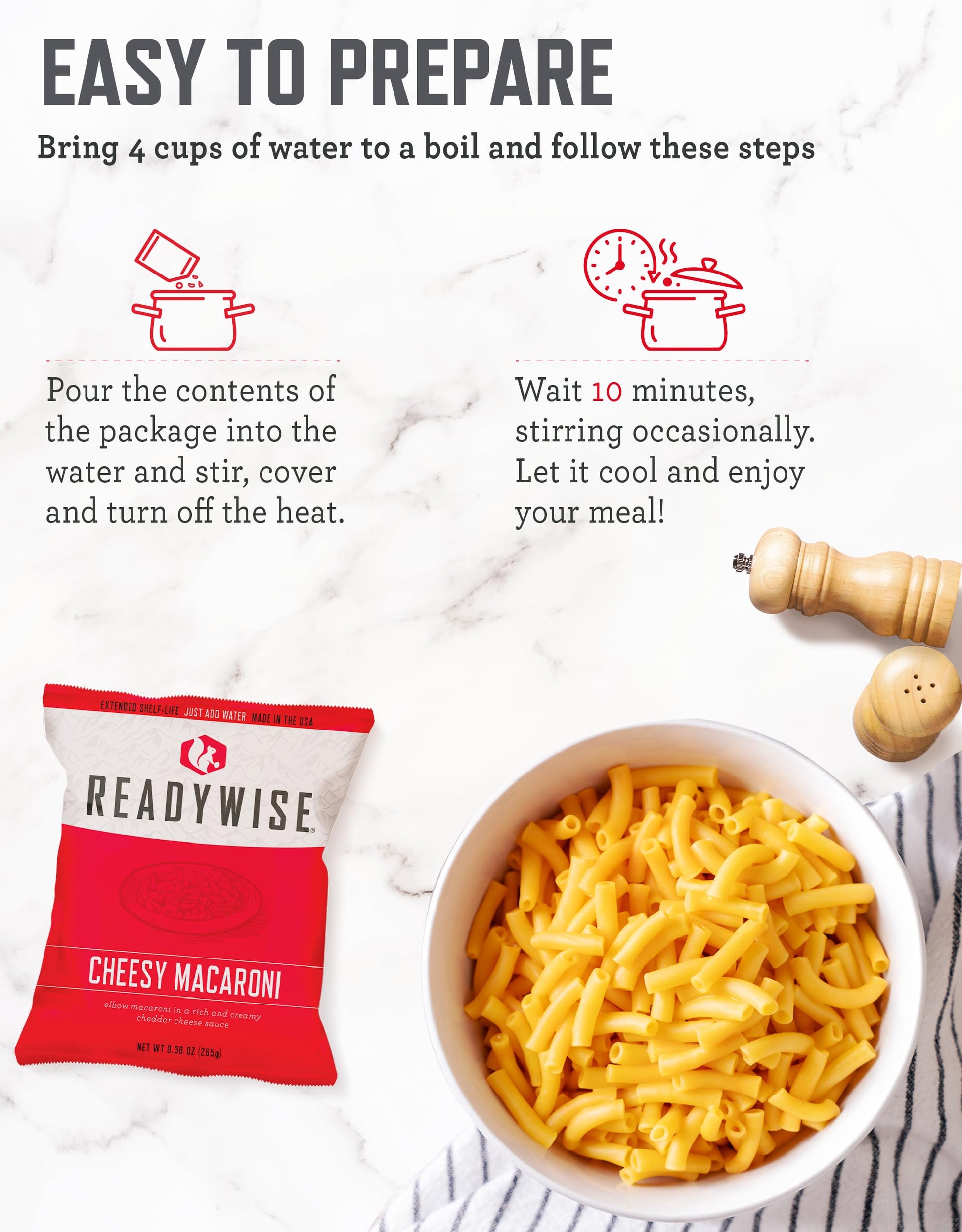 • NUTRITIOUS & YUMMY: READYWISE protein packed disaster preparedness kit delivers bold, savory & satisfying flavor in every portion. Enjoy quick meals or to boost your emergency food kit with options like Cheesy Macaroni, Whey Milk Alternative & more.