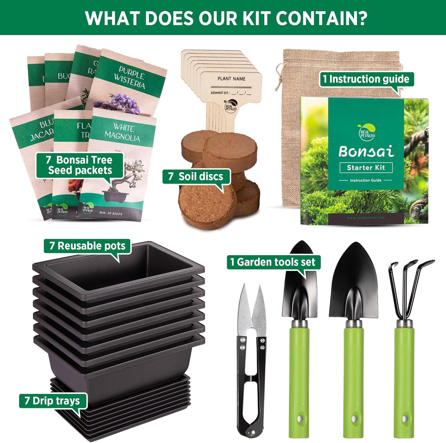 REALPETALED Bonsai Starter Kit – Japanese Bonsai Tree Kit 7 Seeds Pots – Complete Grow Your Own – Plant Lover Gifts Home Gifts for Men and Women