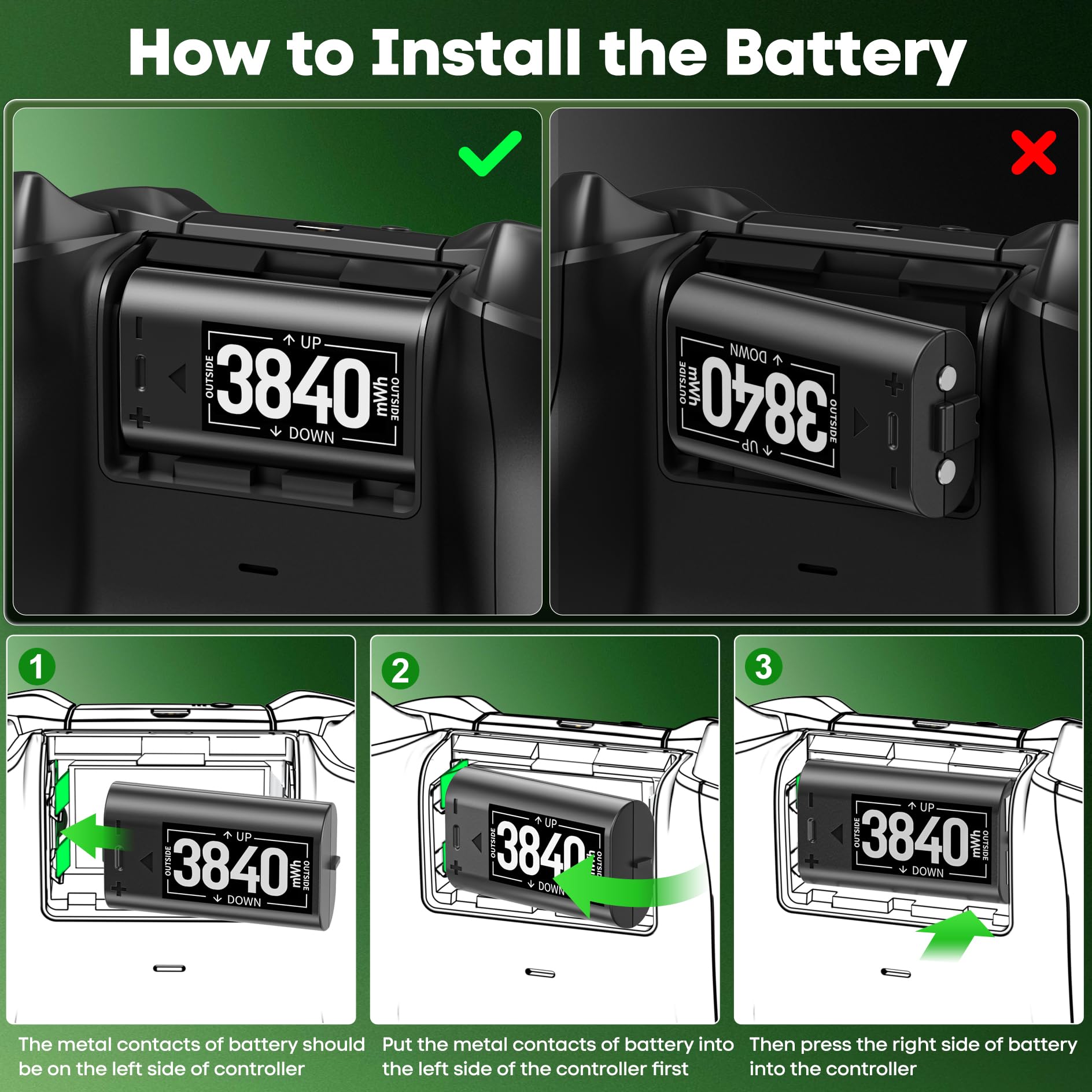 • 【Easy to install and charge】 These rechargeable batteries are well compatible with Xbox Series X|S/ Xbox One/ Xbox One S/ Xbox One X/ Xbox One Elite controller. Place the Xbox One X batteries perfectly in the battery charger dock to charge. It is also very easy to install the Xbox battery into the Xbox controller. Please pay attention to the direction of the battery when installing the battery in the Xbox controller.