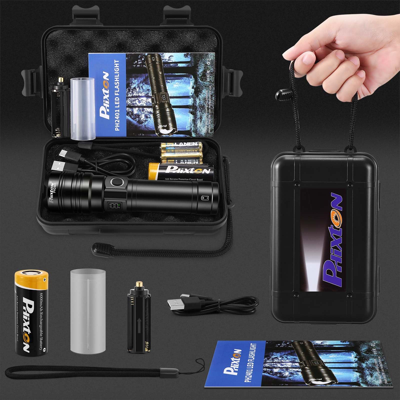 • [2025 UPGRADED ULTRA HIGH BEAM LED] The PHIXTON PH2401 rechargeable flashlight high lumens has features of high concentration and ultra long range, as it is made of a improved PH-L330 30W LED. The focus can be adjust from narrow to wide. When it is narrow, it is a high concentration circle beam, it can be used as a spotlight to illuminate on objects up to 3280 feet away even if it is fog day or rainy day. It is quite ideal for camping, hiking, night walking or other emergency situations.