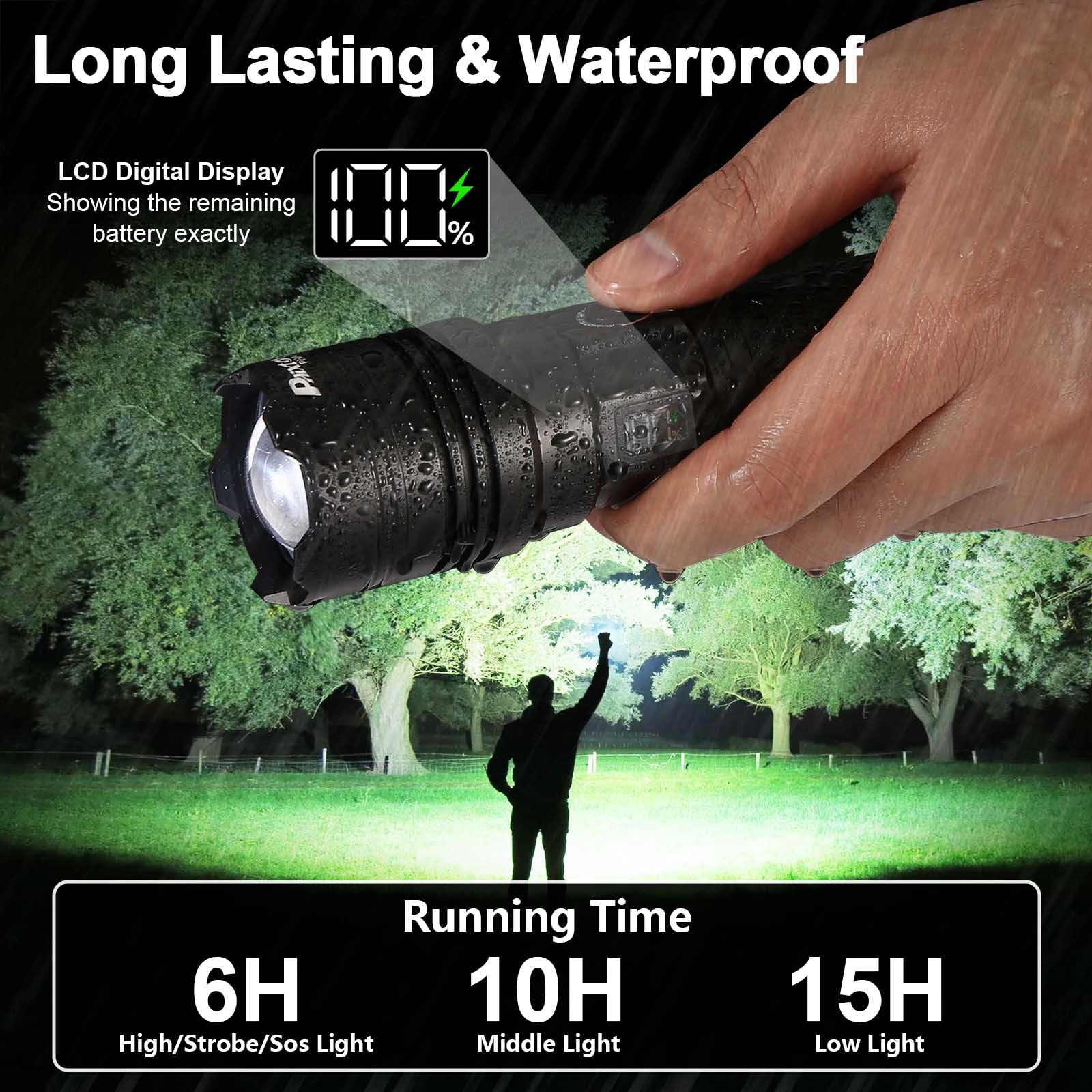• [LONG LASTING & IMPROVED LCD DIGITAL POWER DISPLAY] The PH2401 high powered flashlight is equipped with 6000mAh rechargeable battery, so it can provided up to 15 hours of powerful and non-diminishing brightness. Both the battery and flashlight are built-in a smart chip that has the function of overcharging protection to ensure safety. With compact handheld size, it looks quite cool and portable. The LCD power display shows remaining power exactly, you will get known when to charge it in advance.
