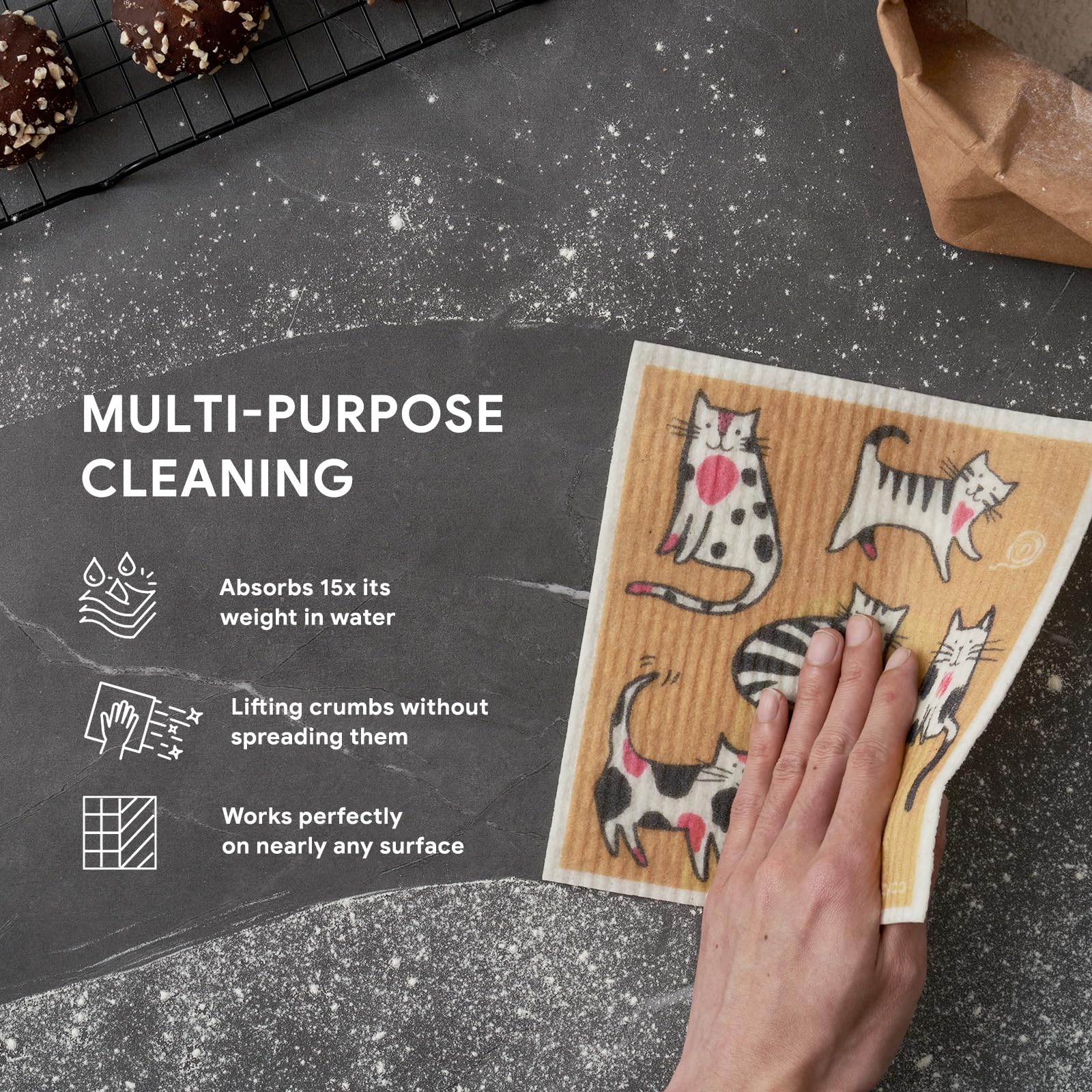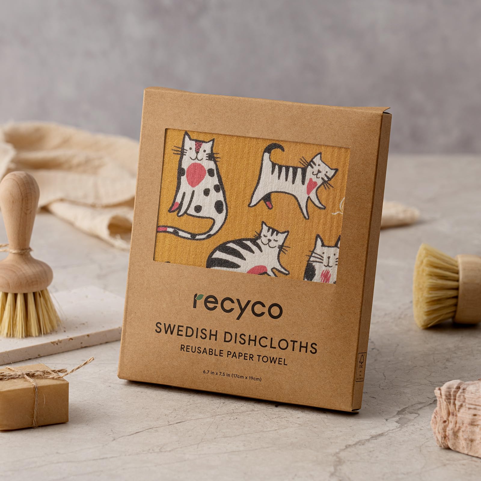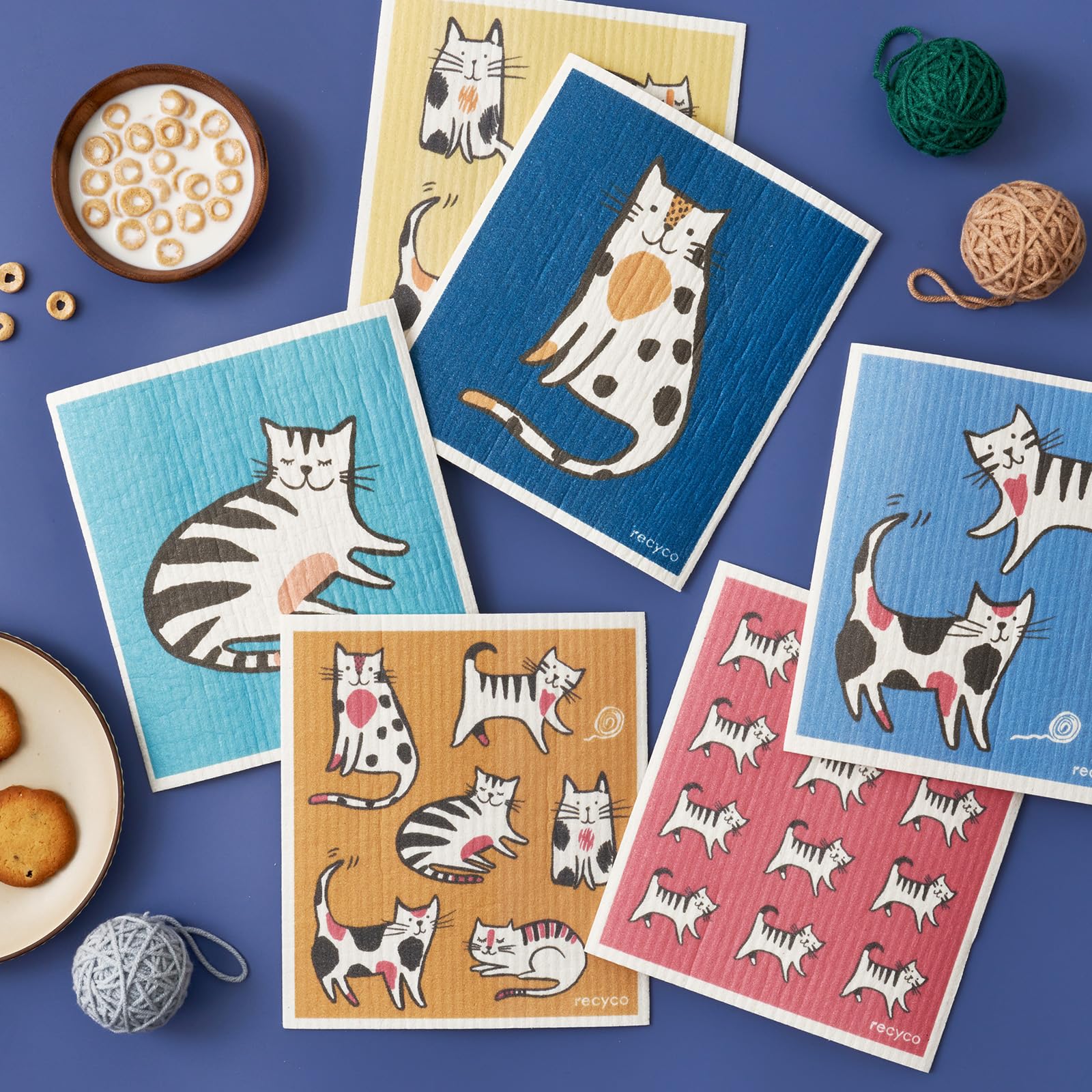 RECYCO Swedish Dishcloths for Kitchen | 6 Pack Cuddly Cats Washable Dish Rags | Cellulose Reusable Cleaning Paper Towels | Absorbent Counter Dish Cloth Sponge Kitchen Wipes, 8" L x 7" W