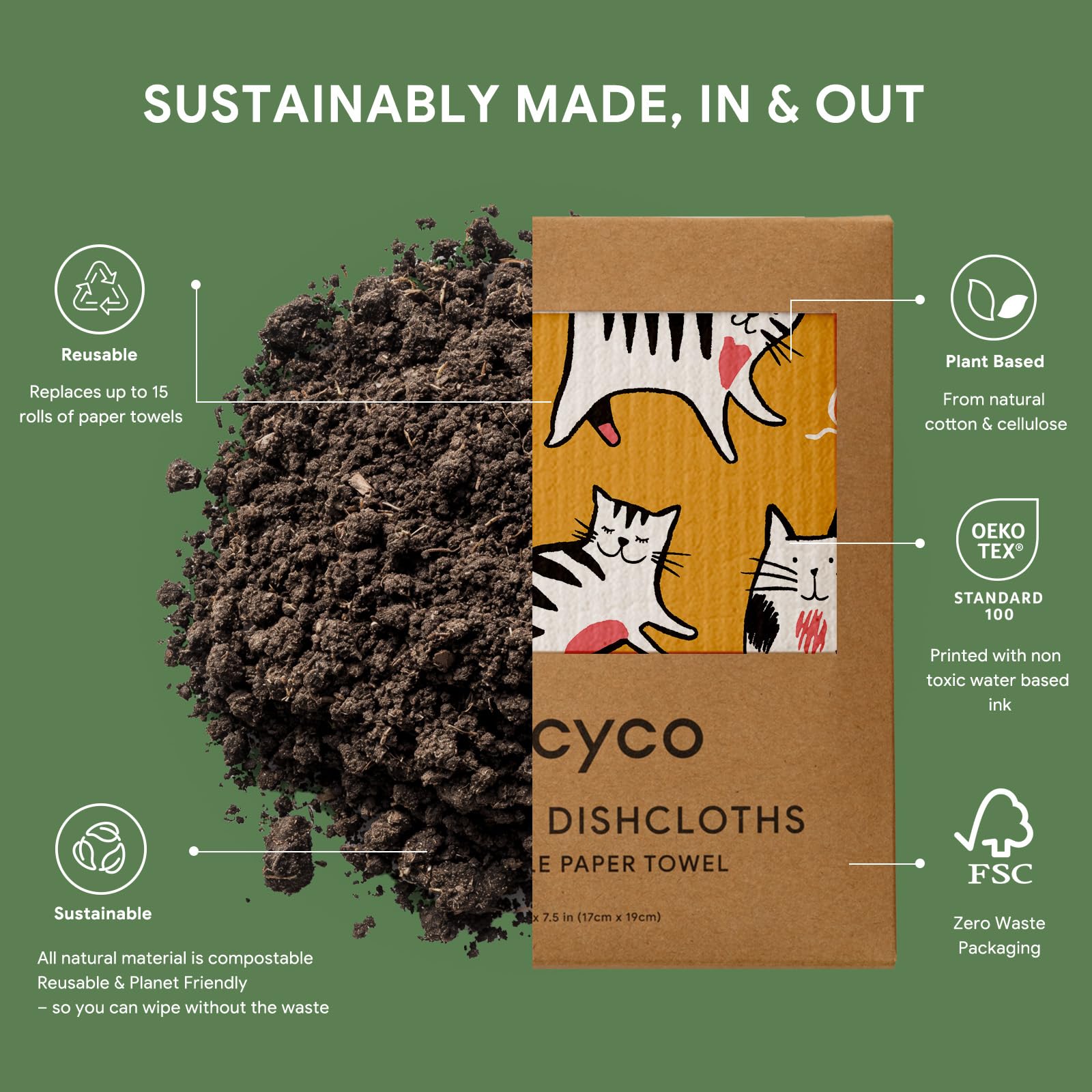 • Plant-Based & Biodegradable: Our 8” x 7” swedish dishcloth is 100% biodegradable, vegan, and free from harmful chemicals. Made from FSC certified cellulose and cotton fibers, it can decompose naturally in just 6-8 weeks, making it your best conscious choice for a greener lifestyle.
