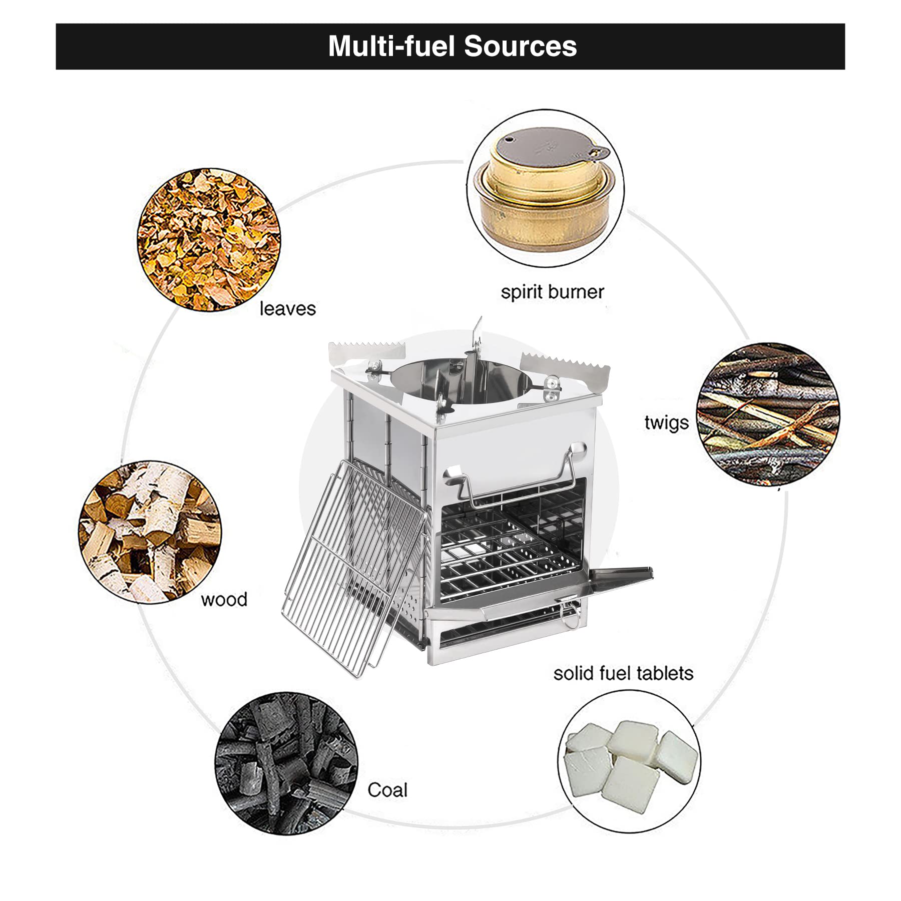 • Multi-fuel Sources: This wood camping stove functions on a variety of fuel sources, including charcoal, alcohol burner, or some wood, branches and dry leaves that you can easily get from nature.