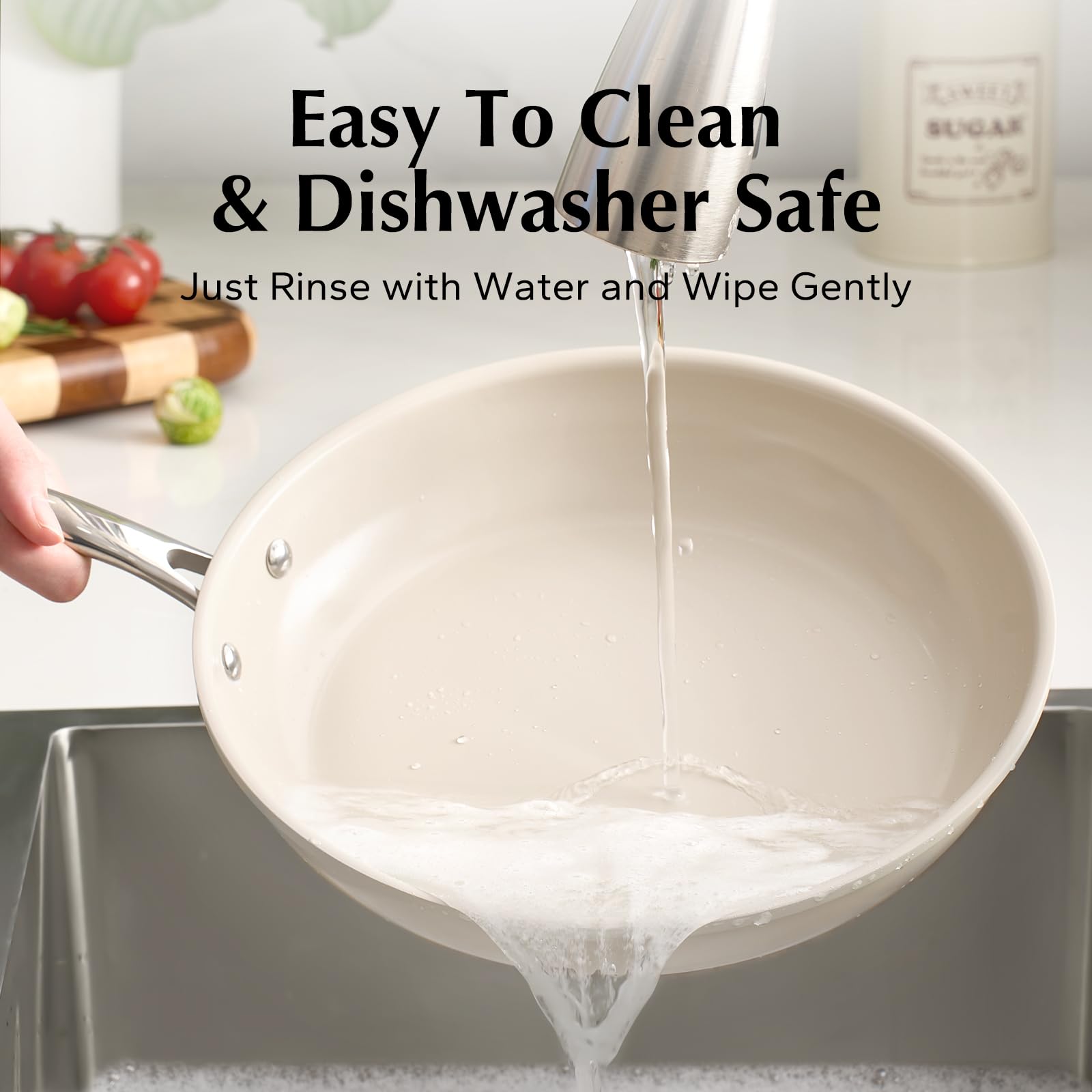 • COOL & STURDY HANDLE: Crafted from lightweight, precision-pressed stainless steel, this ergonomically designed handle ensures a comfortable grip. Double-riveted for exceptional strength and maneuverability, the ceramic skillet pan empowers you to seamlessly transition from stovetop to oven, allowing you to achieve that flawless sear, brown toppings, or even bake