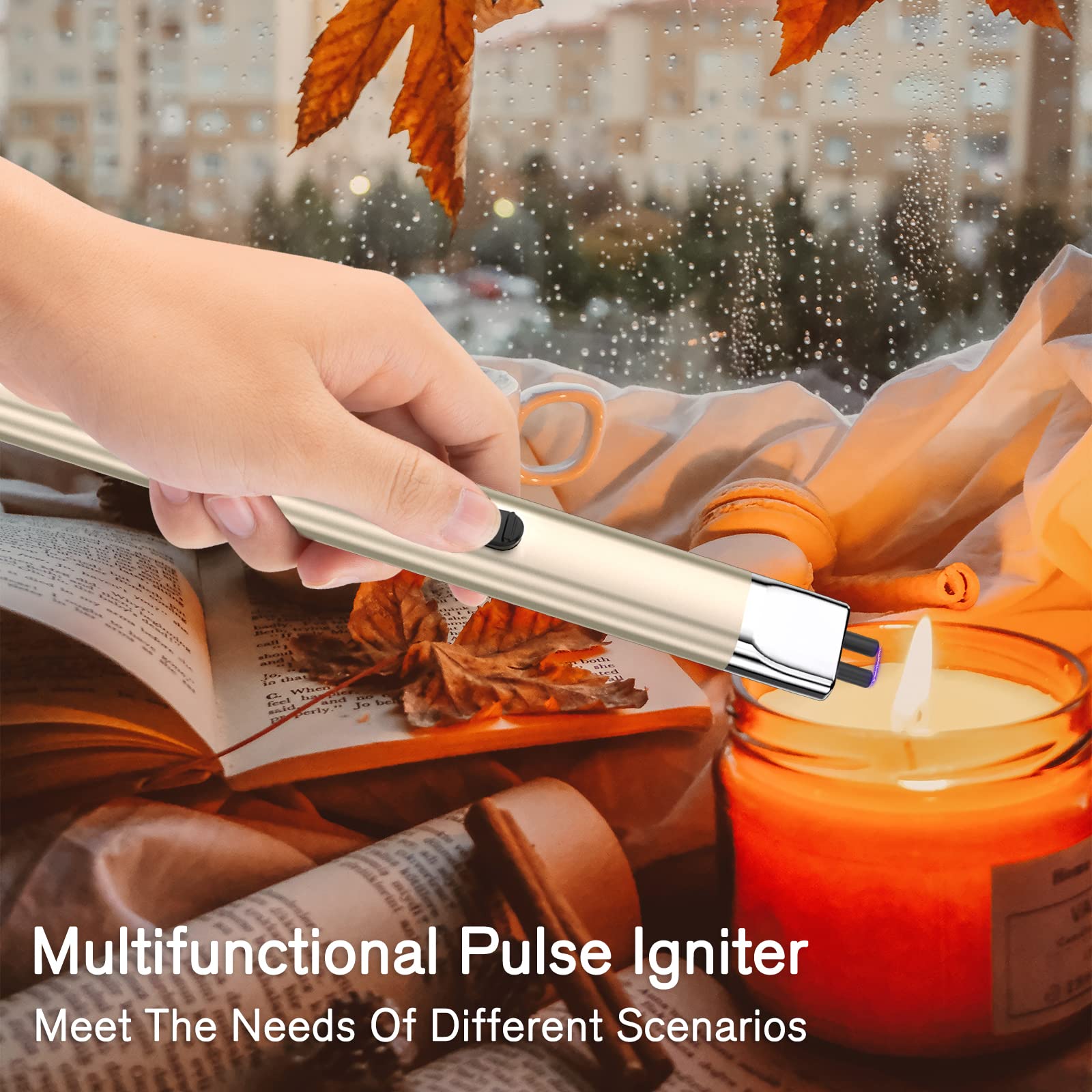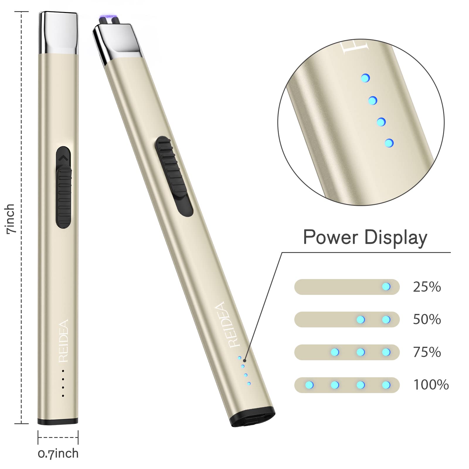 REIDEA Electric Candle Lighter, Retractable Top Windproof Flameless USB Rechargeable Arc Lighter with Safe Button and Power Indicator for Candle, BBQ and Fireworks, R1 Flat, Champagne Gold