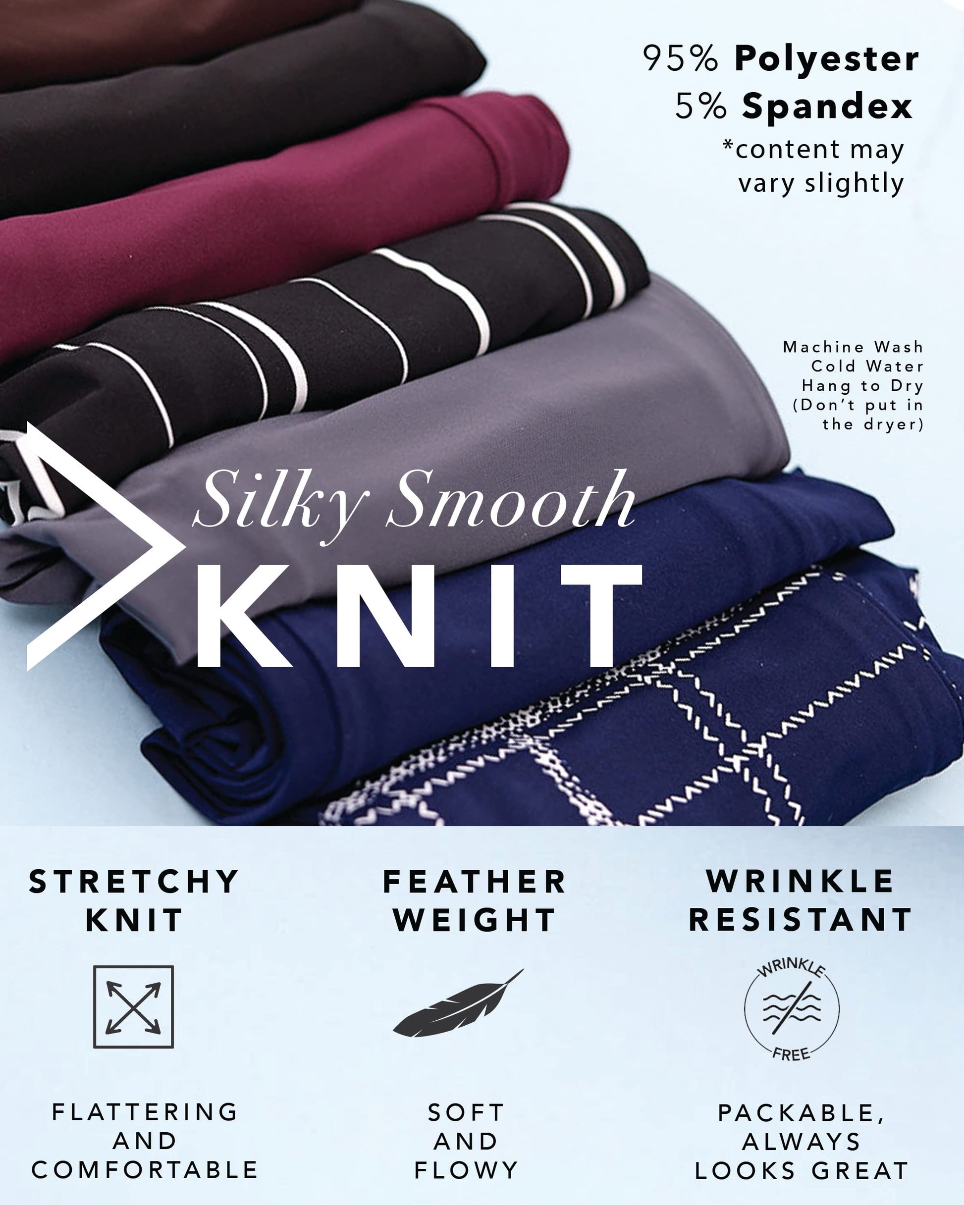 • FABRIC: Silky smooth medium weight knit with just the right amount of body: 92% Polyester, 8% Spandex. Variety of vibrant colors and curated prints for each new season! Wrinkle-resistant fabric, great for travel, machine washable (but hang to dry)