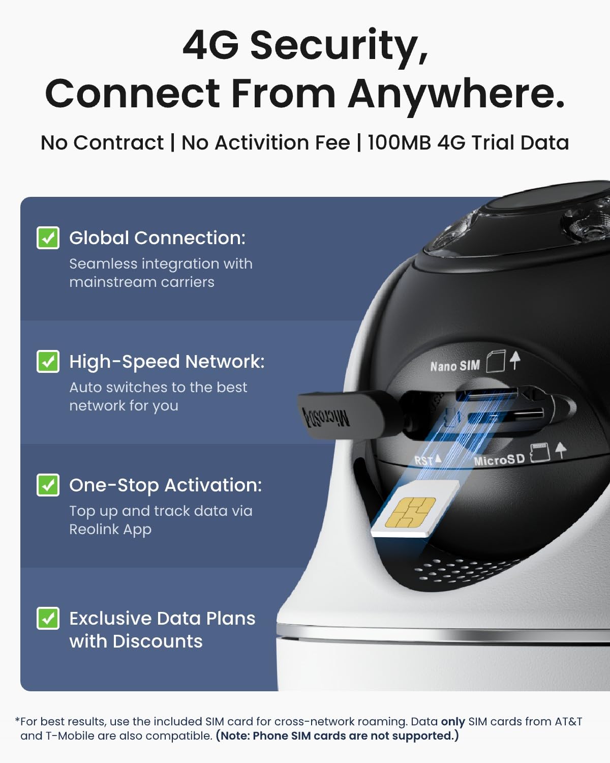 • 3G/4G LTE Network & Forever Solar Power: The combination of the solar power panel and 4G connection on this cellular camera saves you from the troubles of finding sockets or networks outdoors Ideal for country houses, construction sites, etc. Reolink SIM card is included. Users can activate, refill the SIM card and track data usage via Reolink App.