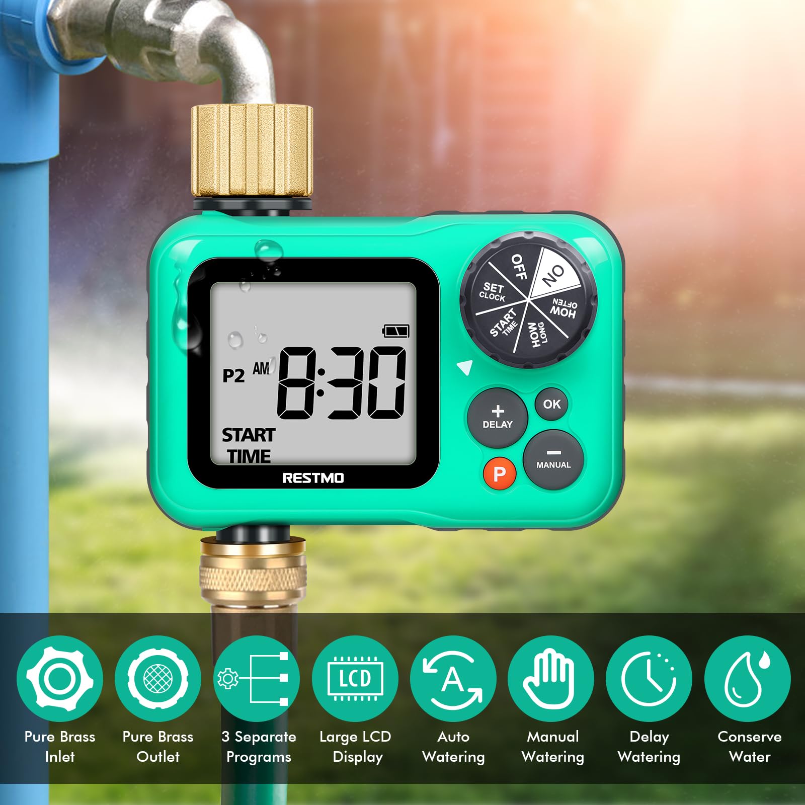 RESTMO Sprinkler Timer with Brass Inlet & Outlet, 3 Separate Programs Hose Timer, Programmable Water Timer for Garden Hose, Manual | Rain Delay | Automatic Watering System for Drip Irrigation and Lawn