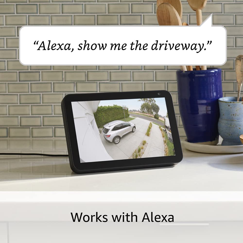 • For added peace of mind, pair with Alexa to help you keep an eye on your home. Connect with Alexa to hear motion alerts on your compatible Echo device or see a Live View with an Echo Show, Fire TV, or Fire Tablet. Talk to visitors by saying, “Alexa, talk to the front door.”