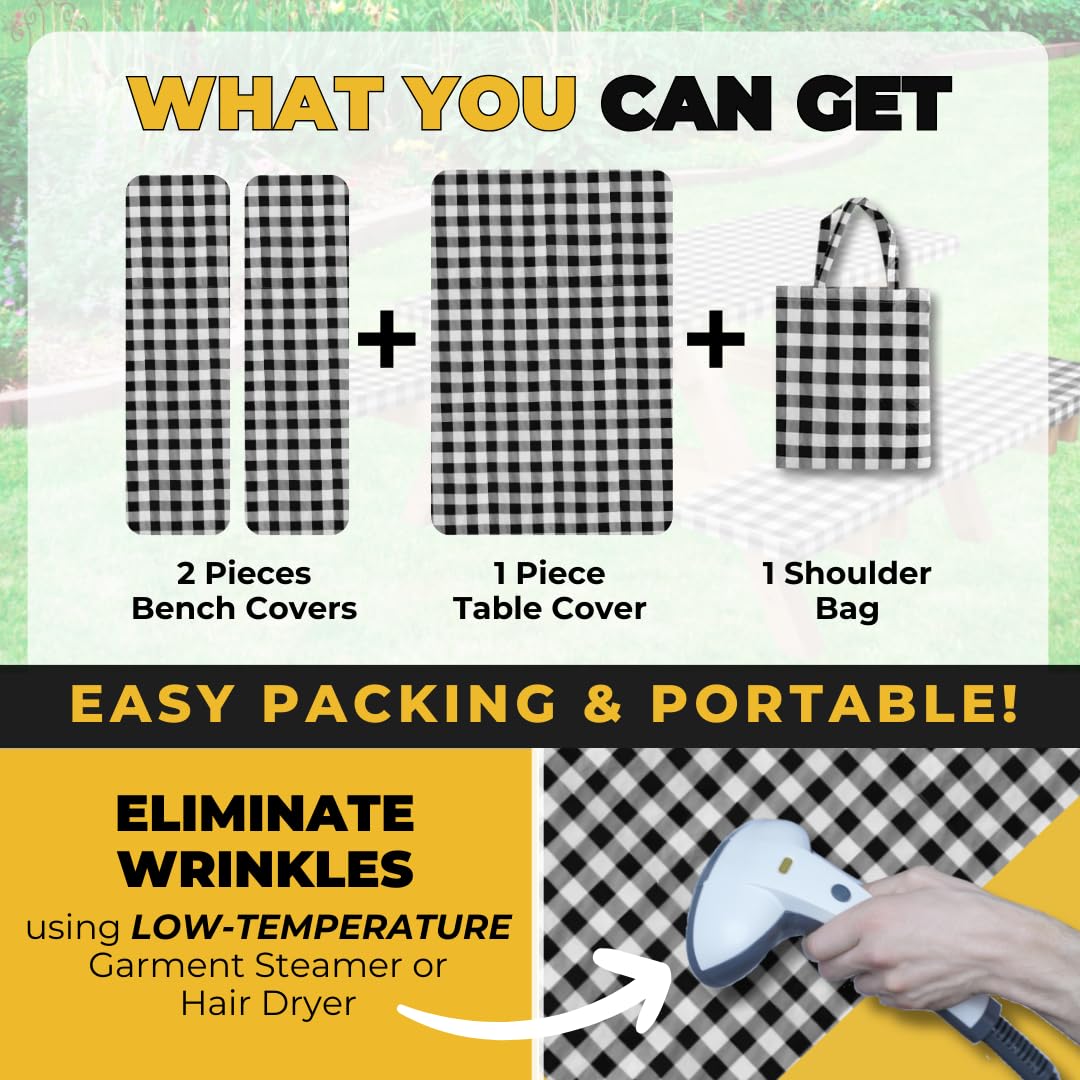 RNOONY Vinyl Fitted Picnic Table Cover with Bench Covers and Bag, 6ft Outdoor Waterproof Windproof Tablecloth with Elastic Edges. Camping RV Gear Campers Must Have 72x30 Inches 4 Pcs Set (Black)