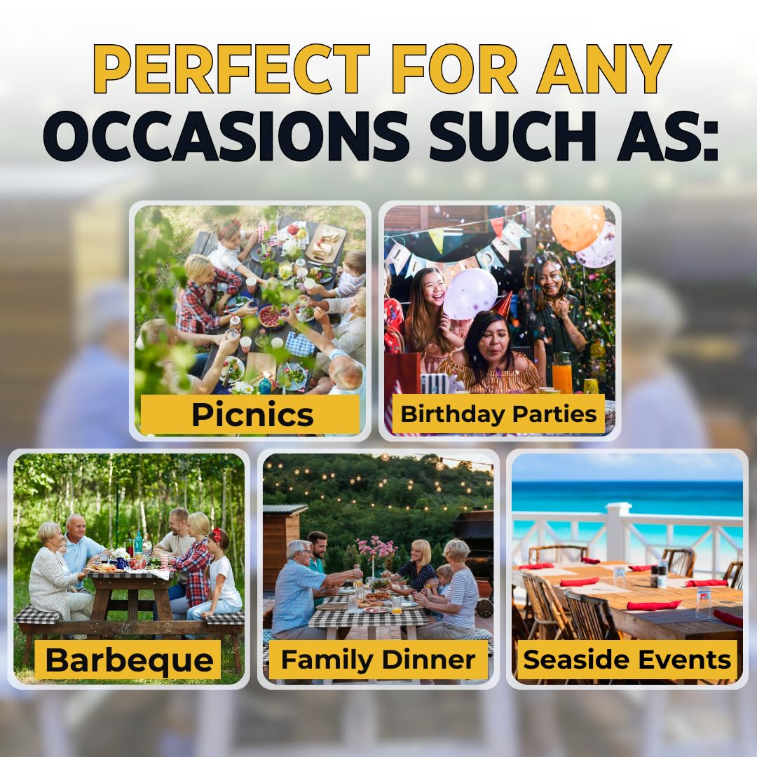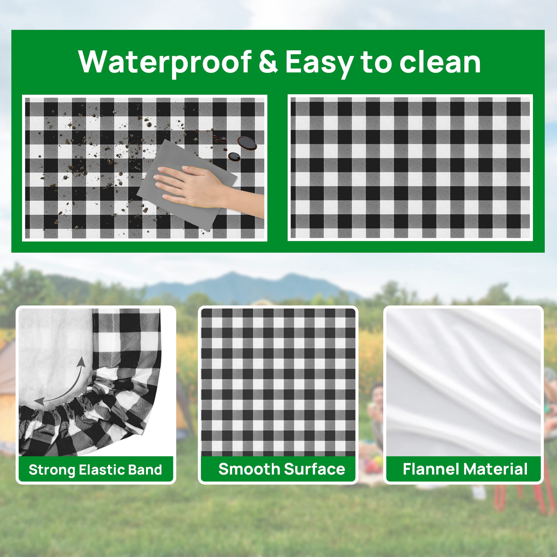 • No more dirty tables & benches, No more splinters & messy accidents when the wind blows. Elastic corners and soft flannel backing will keep the picnic table cloths securely snug and tight fit in place without CLIPS