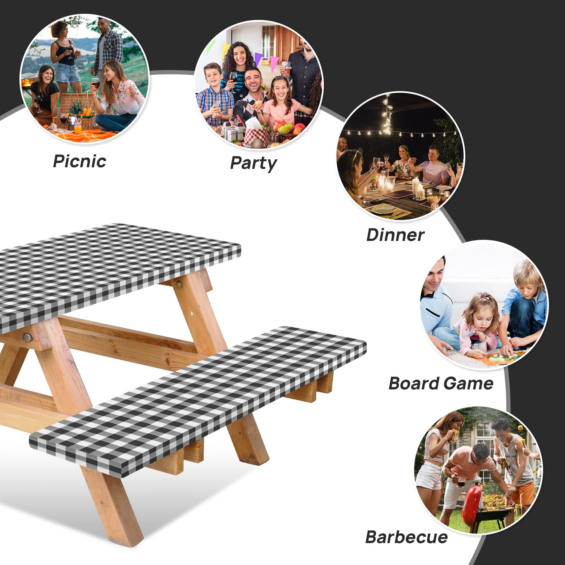 • 3 Pack vinyl fitted tablecloth set Includes 1 table cover 72x30' and 2 bench seat covers measuring 12x72'. You could stretch it to fit a 6-foot camping table. Excellent for picnics and outdoor gatherings, camping, barbeque and other outdoor activities.