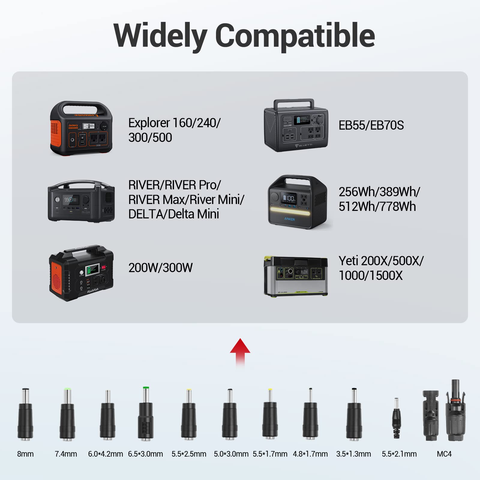 • MADE FOR SOLAR GENERATORS - With the included 10 different sizes of connectors, Rockpals 100 watt folding solar panels are compatible with most solar generators on the market. 8mm DC Adapter for Jackery Explorer/Anker/Goal Zero Yeti, 5.5*2.1mm for Flashfish/ROCKPALS 250/300/500W. Connect to the XT60 cable (B09QQRV4V8), Rockpals 100 watt panel solar is compatible with EcoFlow River Delta/Bluetti EB3A EB55; Connect to the Anderson cable (B0B1GW13C4), it is compatible with Jackery 1000/Anker 545