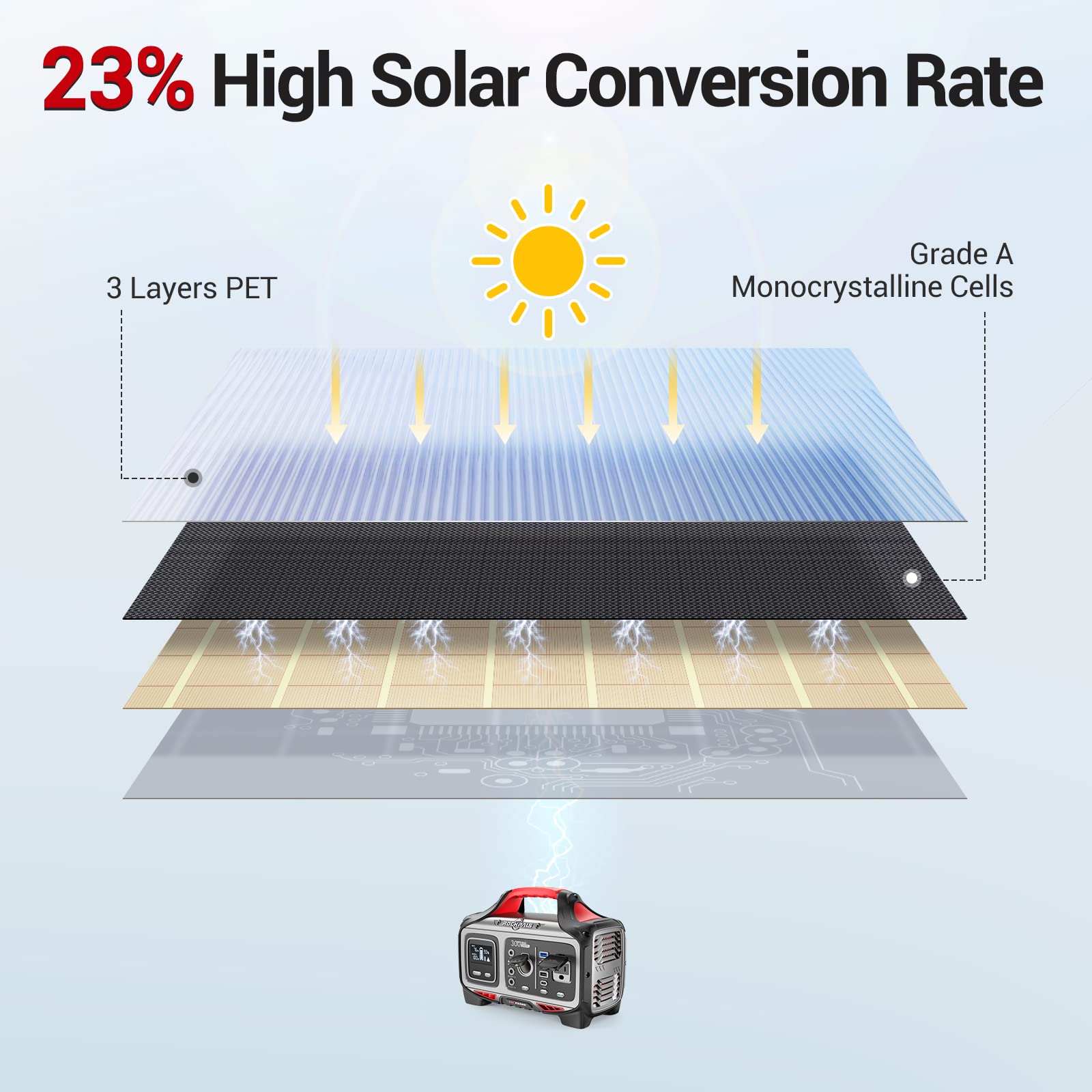 • HIGH CONVERSION EFFICIENCY - The A grade 100-watt monocrystalline silicon solar cells provide a high conversion efficiency of up to 23%, generate more energy and perform better than conventional panels in strong sunlight, produce maximum power to charge compatible devices in the least time. Ideally suited for outdoor life, camping, RV trip, picnic, fishing, home emergency, off-grid living power outage supplies, and hurricane preparedness items