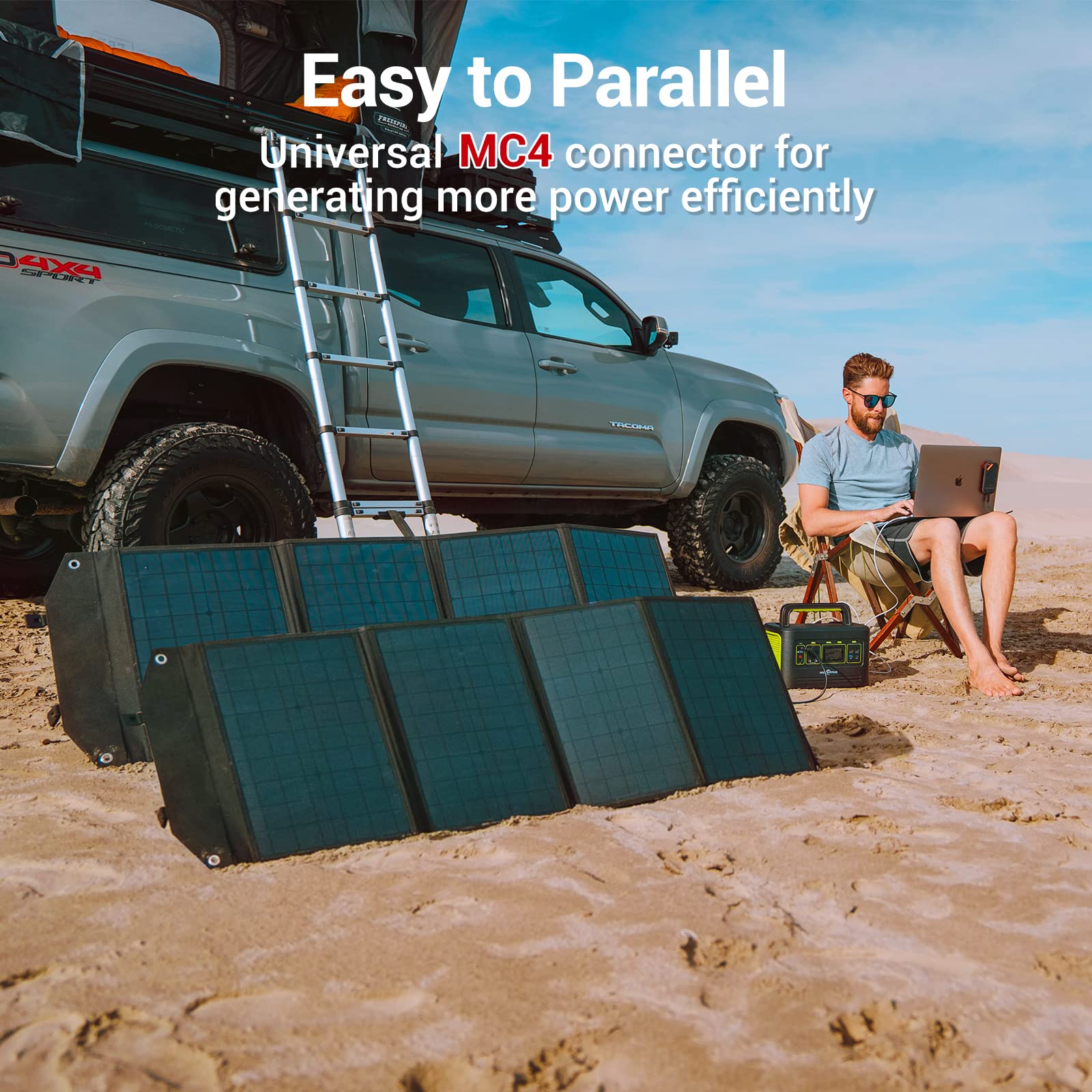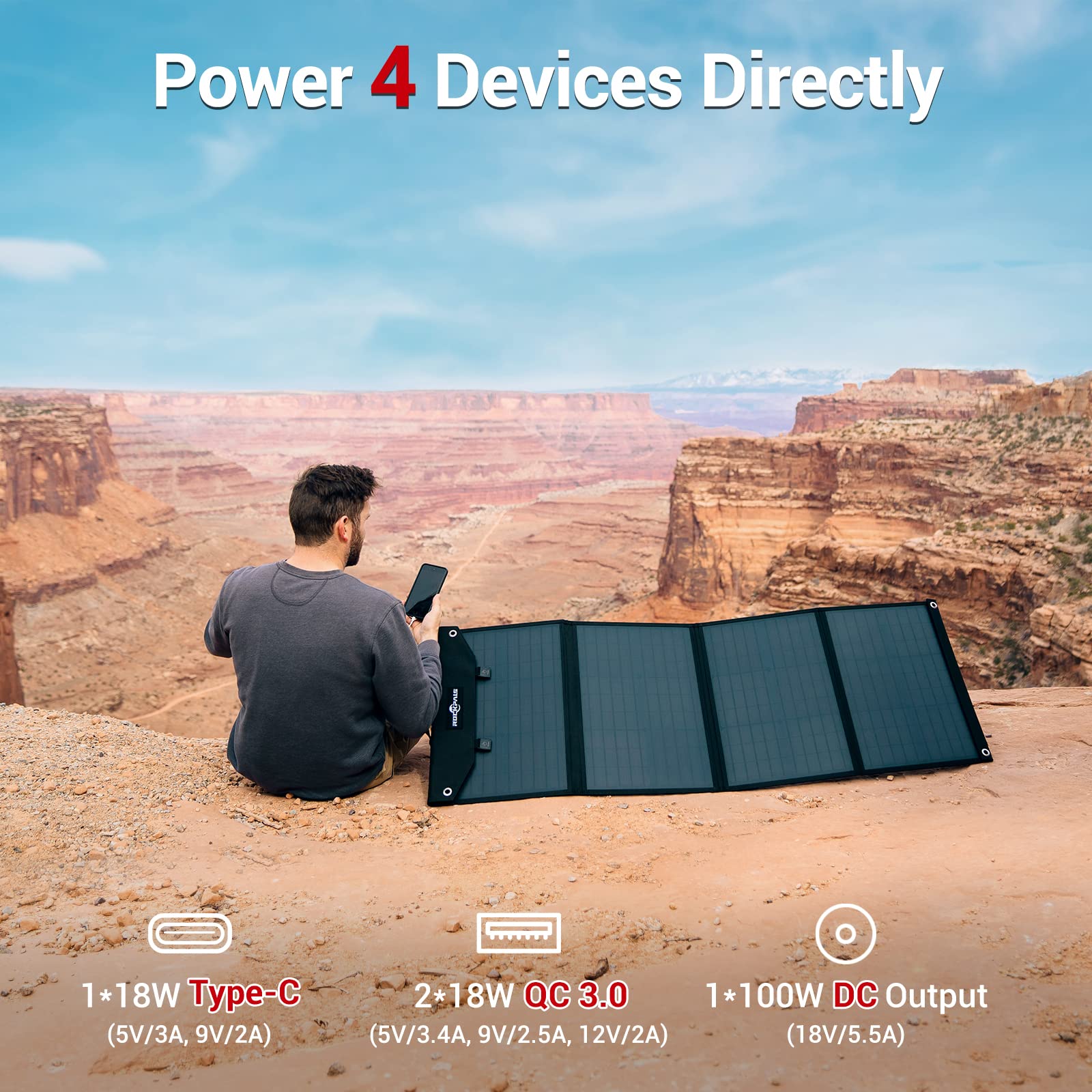 • SMART CHARGING TECHNOLOGY - The built-in smart IC chip intelligently identifies your devices, and maximizes its charging speed while protecting your devices from overcharging and overloading. Equipped with 18W USB QC 3.0 and 18W Type C output, provides 4 times the faster-charging speed for your smartphones, tablets, etc. With a professional parallel connector, you can also parallel 2 SP003 100W solar panels to get more output to recharge high capacity power station faster