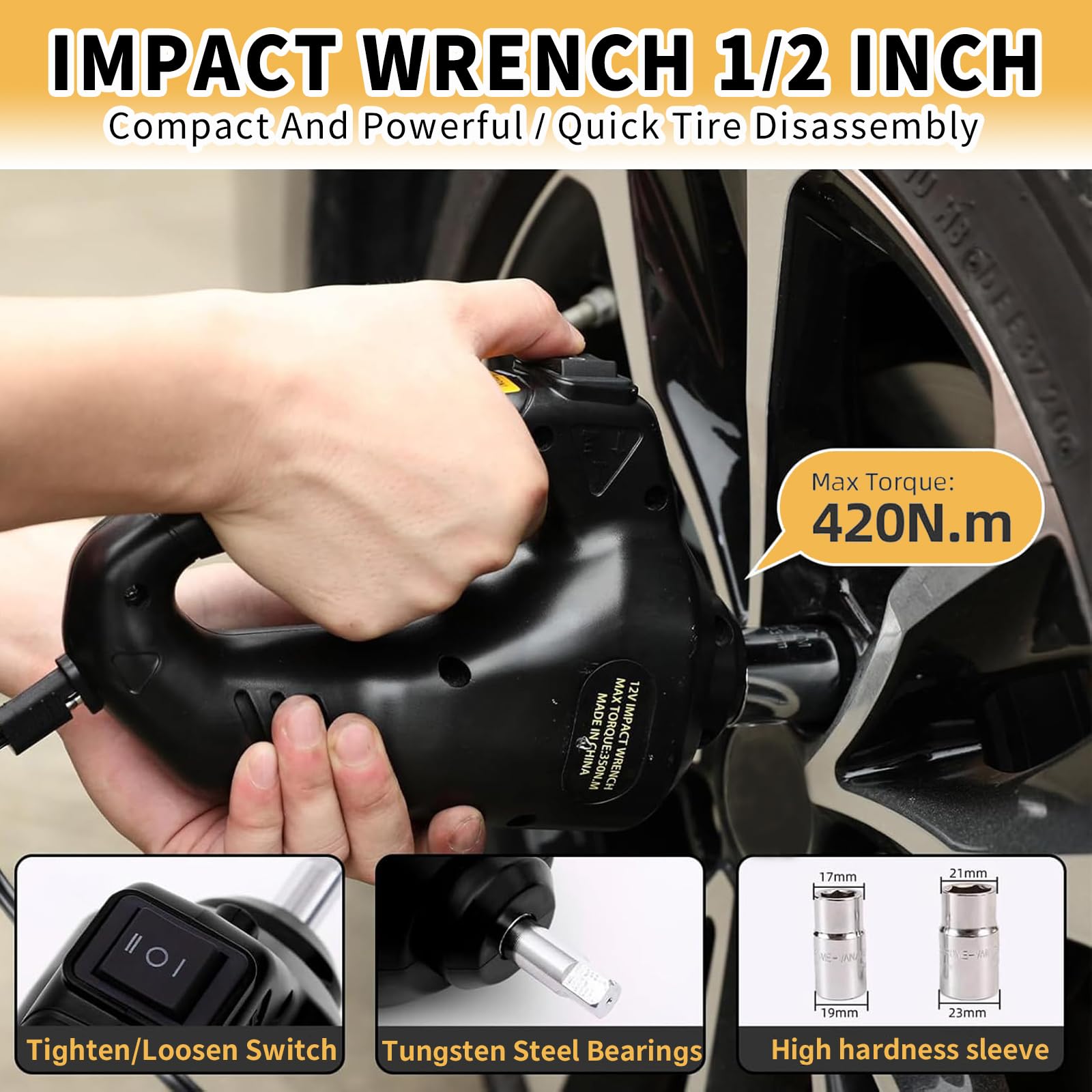 • Impact Wrench for Quick Tire Change: Includes 350N·m impact wrench with 17-19mm and 21-23mm sockets, compatible with most vehicle lug nuts. Low-noise motor enables quick nut removal. Paired with electric car jack in compact case for fast, organized use