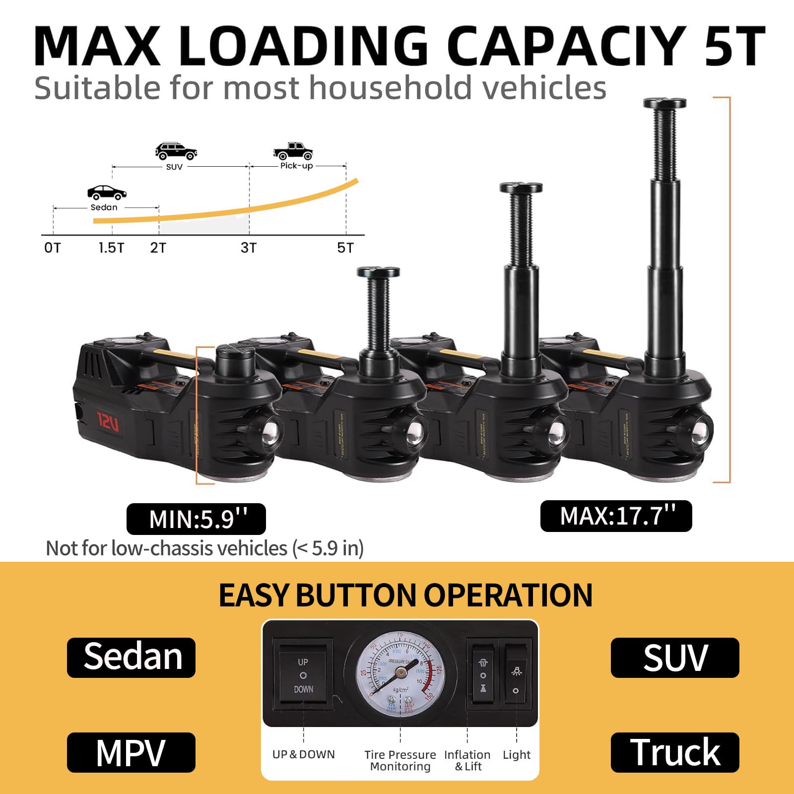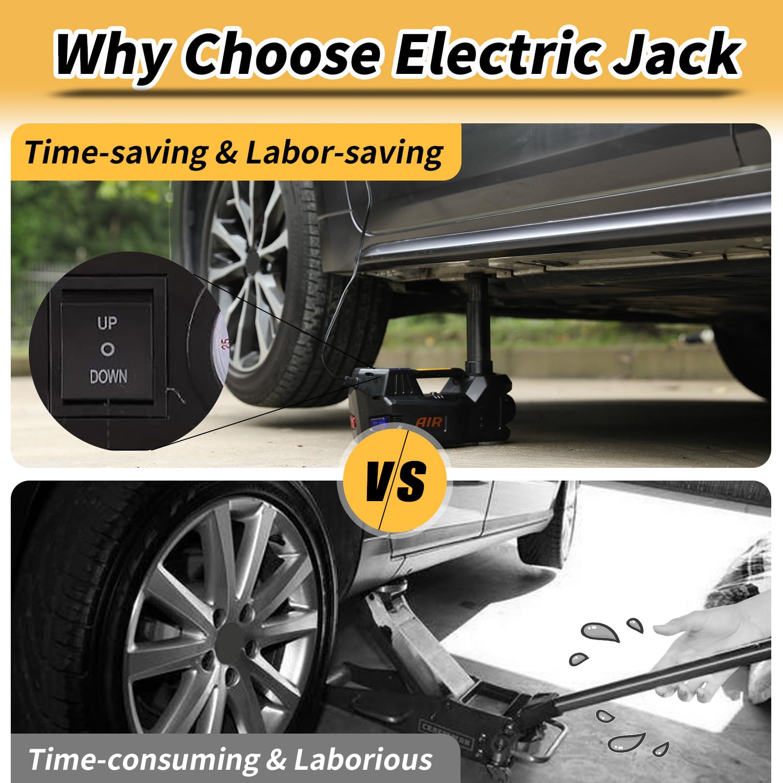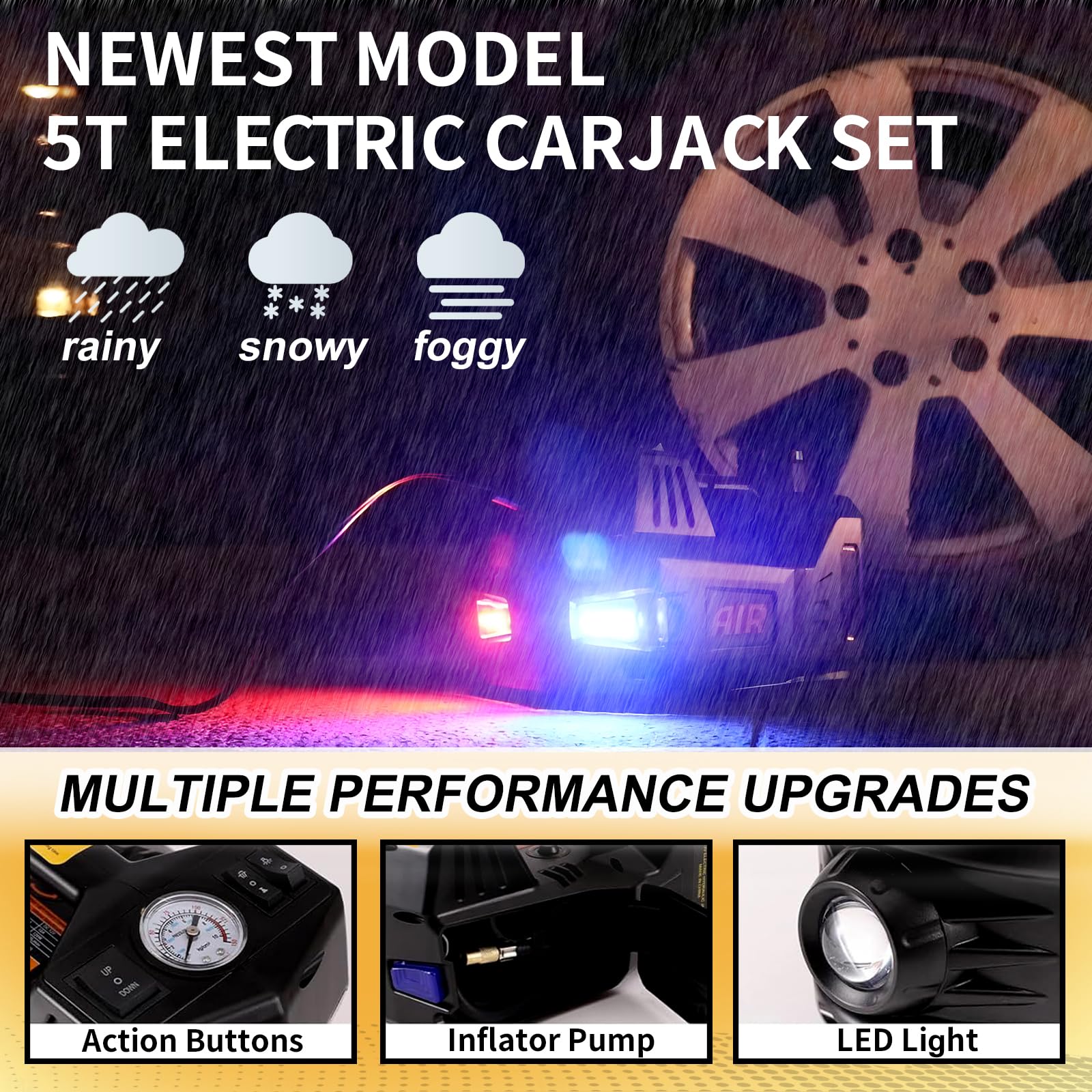 • Safe & Reliable: Electric jack uses a stable hydraulic system with automatic stop at max height or overload. Self-locking design prevents slippage during use. Includes pressure relief wrench plus LED and warning lights for safe tire work, even at night