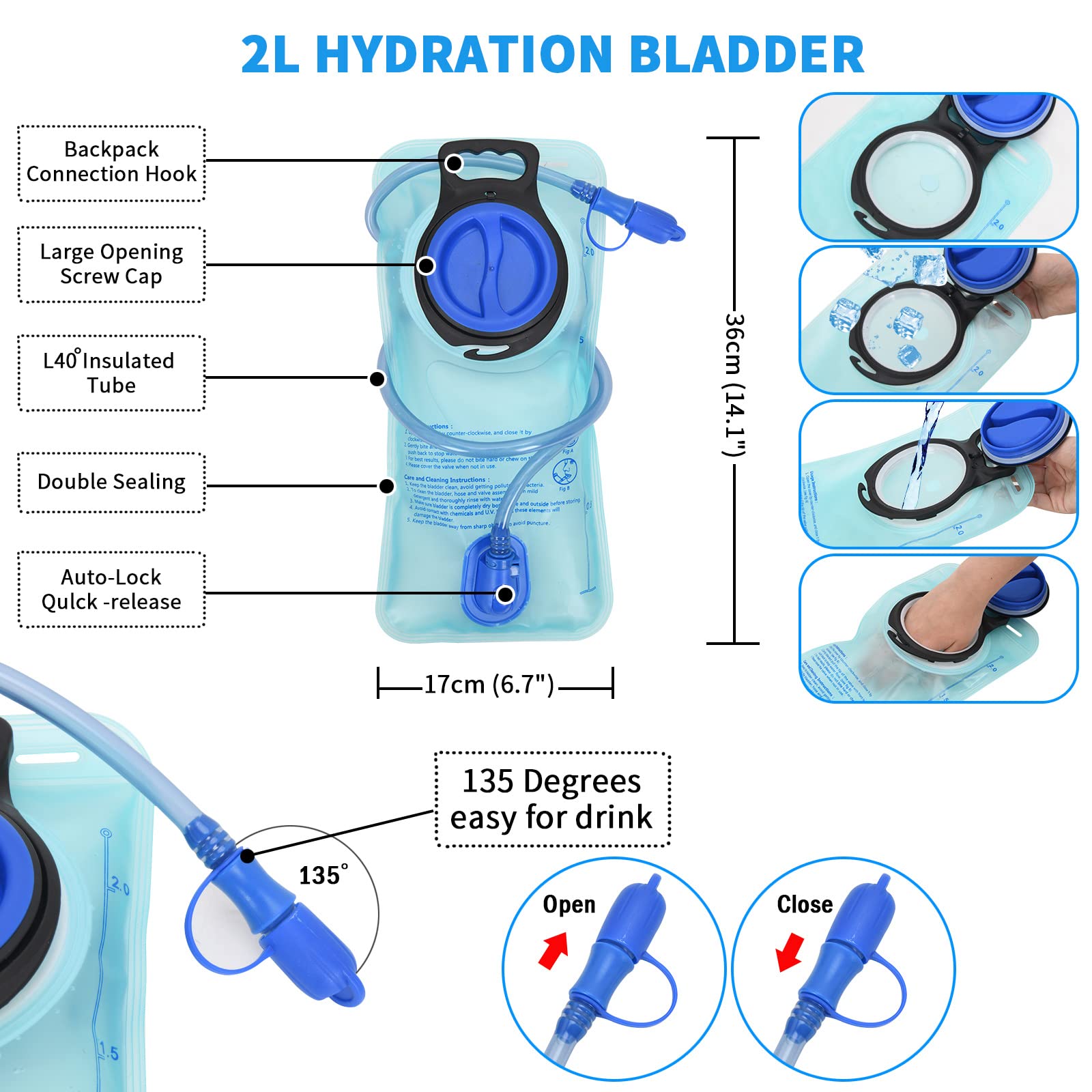 • 【BPA FREE hydration bladder 70 Ounce-2 Liter】Included 2L leakproof and stability hydration bladder,complete with soft high flow bite mouthpiece with easily accessible on/off,valve BPA FREE food grade,test report will be sent to your e-mail.the size of water bladder is perfect offer a nice balance of reasonable weight and bulk while providing a sufficient quantity of water.