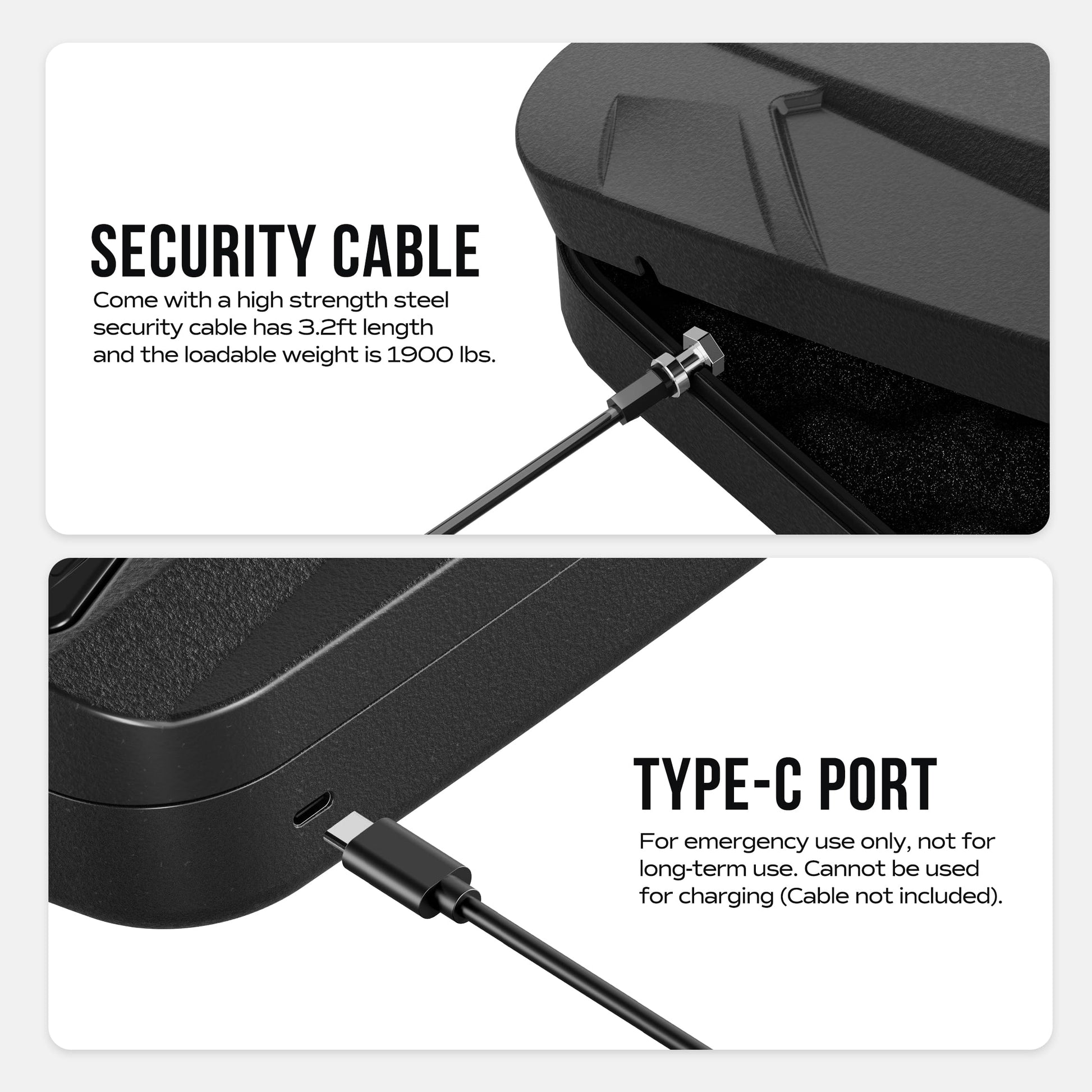 • Emergency Power Supply: The fingerprint safe is designed with a built-in USB Type-C port on the side, making it easier to use in an emergency situation when the batteries are dead and the keys are missing. This port is intended for emergency use only and is not intended for long-term use