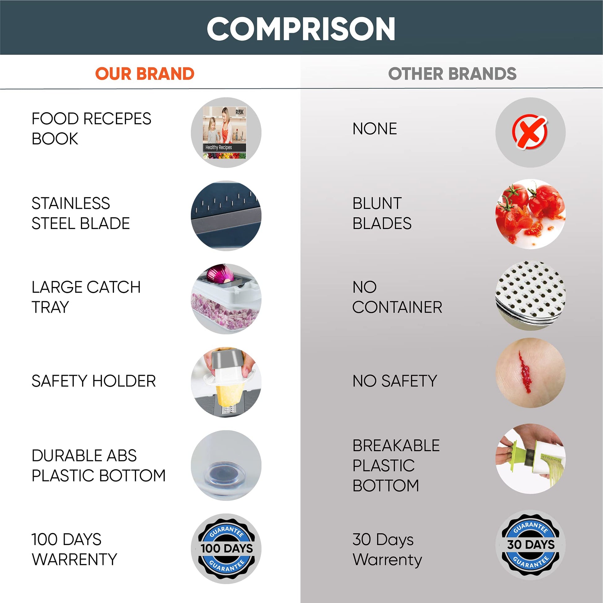 • 【Professional and Multi-Purpose Vegetable Slicer Machine】Everything you need in this multifunctional 22 in 1 chopper vegetable cutter, our hand food choppers and dicers equipped with 11 interchangeable stainless steel blades, include egg separator, egg slicer, lemon squeezer, large capacity container, healthy recipes, and more, let you julienne, shred, chop, dice, grate, and slice vegetables with easy, Now start enjoying your kitchen fun with RUK onion slicer