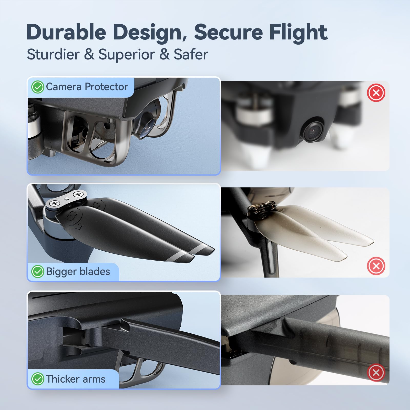 • 【INTELLIGENT GPS FLIGHT】Using GPS features like Follow Me, Waypoint Flight, and Point of Interest can enhance the flying experience. If the drone's battery is low, the signal is weak, or press the one-tap return button, the drone will auto-return home.