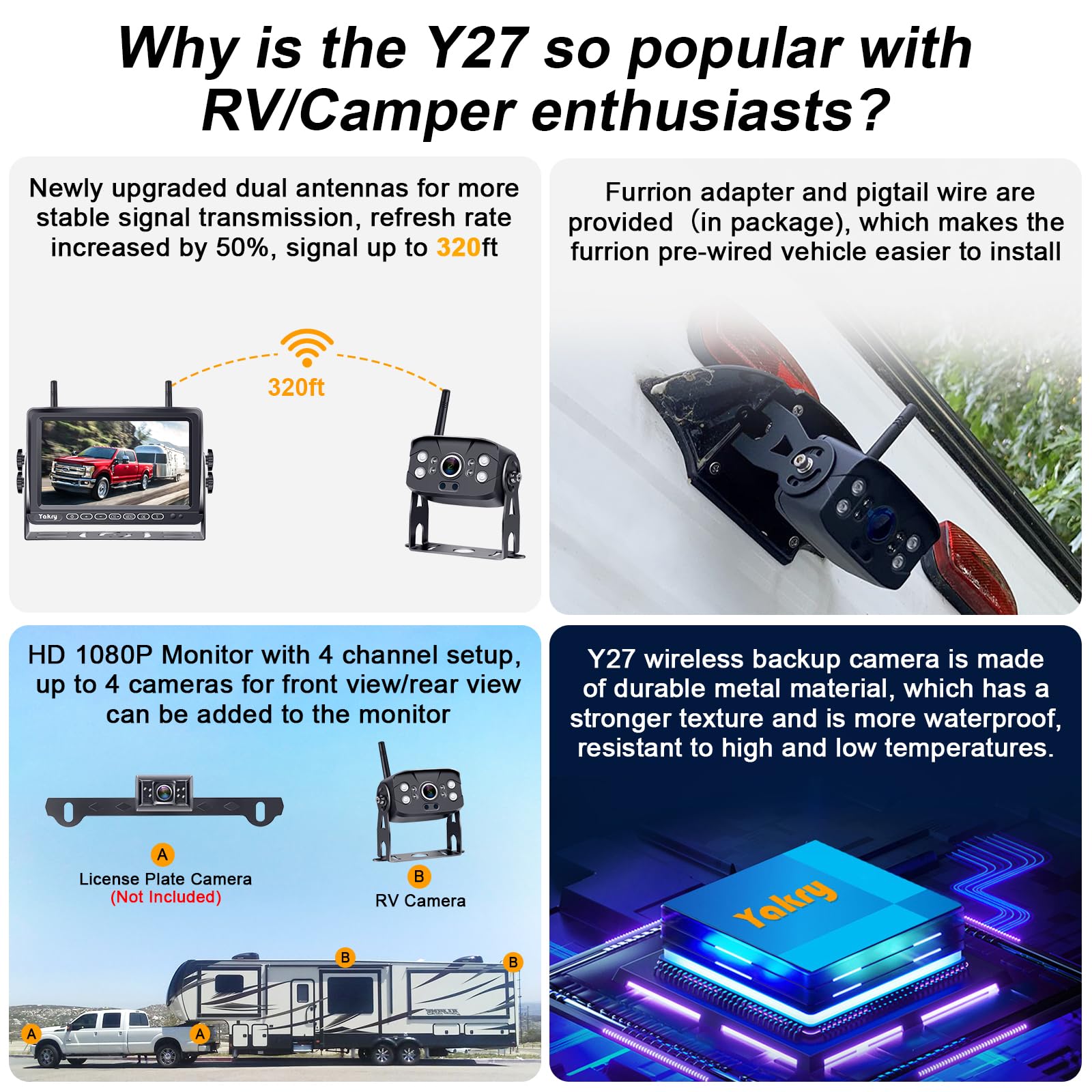 RV Backup Camera Wireless Plug and Play: Pre-Wired for Furrion System Recording Wide View Rear View Camera Clear Night Vision HD 1080P 7'' Touch Key Monitor for Trailer Camper Motorhome Yakry Y27-N