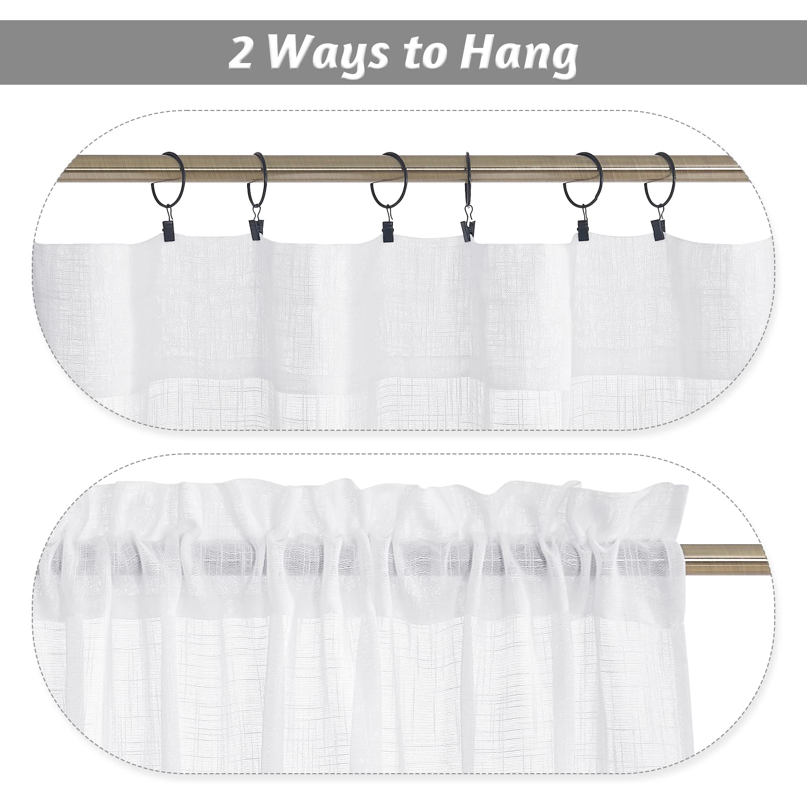 • PRIVACY SEMI SHEER - Beautifully frames your upper portion of windows. Softly filtering out harsh sunlight and appears a hazy light & airy look for bedroom, kitchen, living room, bathroom, laundry room, studio...