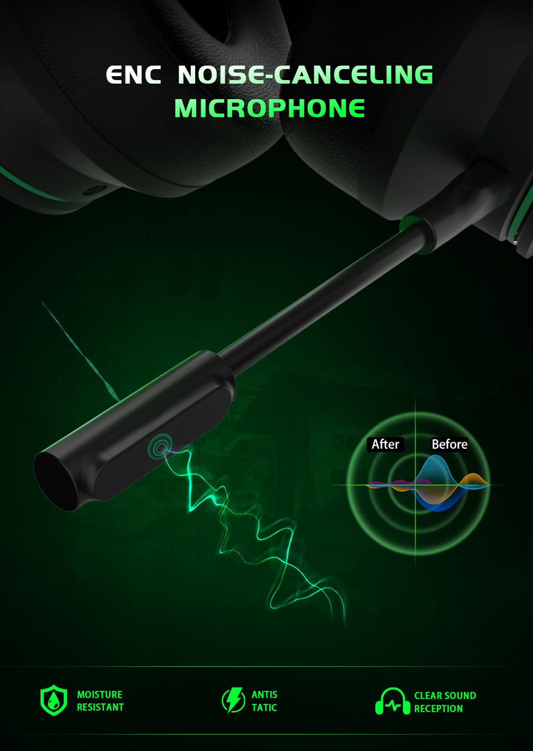 RYR Wireless Gaming Headset for Xbox Series X|S, Xbox One, PS5, PS4, Mac, Bluetooth 5.3, 3D Surround Sound, Rotatable Earmuffs, Gaming Headphones with Noise Canceling Microphones-Blackgreen