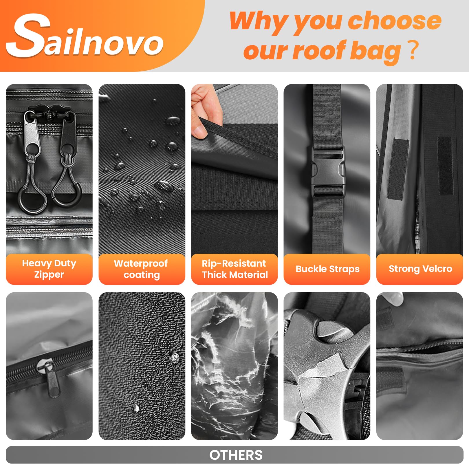 • WHAT YOU GET: 1 car rooftop carrier bag, 4 safety hooks, 2 reinforced straps, 1 storage bag, 1 user manual. The Sailnovo cargo carrier is water and fade-resistant, dust, sun, wind, and rain resistant. You don't have to spend as much as you would for a roof box, but you have a bag that has all the features of a car roof box!