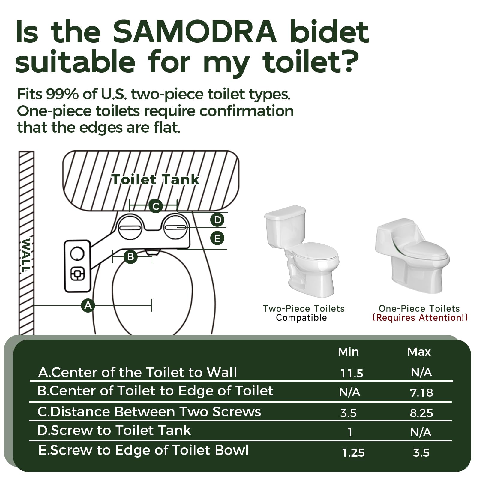 • Dual Spray Nozzles: Bidet attachment features dual nozzles for two spray modes: front cleaning for women's private, rear cleaning for men & women. Samodra upgrades knob switch to button design for easier to switch between patterns