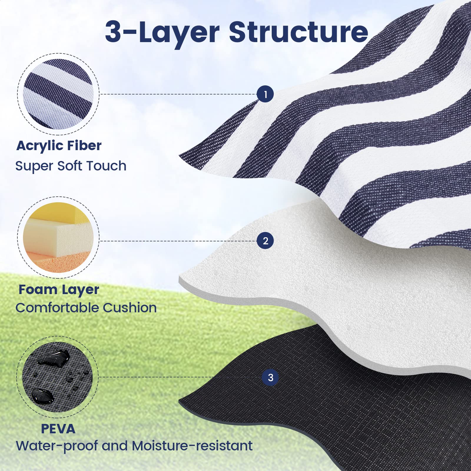 • 3 Layers Comfortable Structure: The Acrylic fiber on the top, foam in the middle, and a waterproof layer on the bottom. The top layer is soft enough to let you comfortably nap in the sun and gentle enough for a baby to lie. With the foam in the middle, you won’t feel uncomfortable even if you picnic for a long time. The waterproof bottom resists dirt, sand and water.