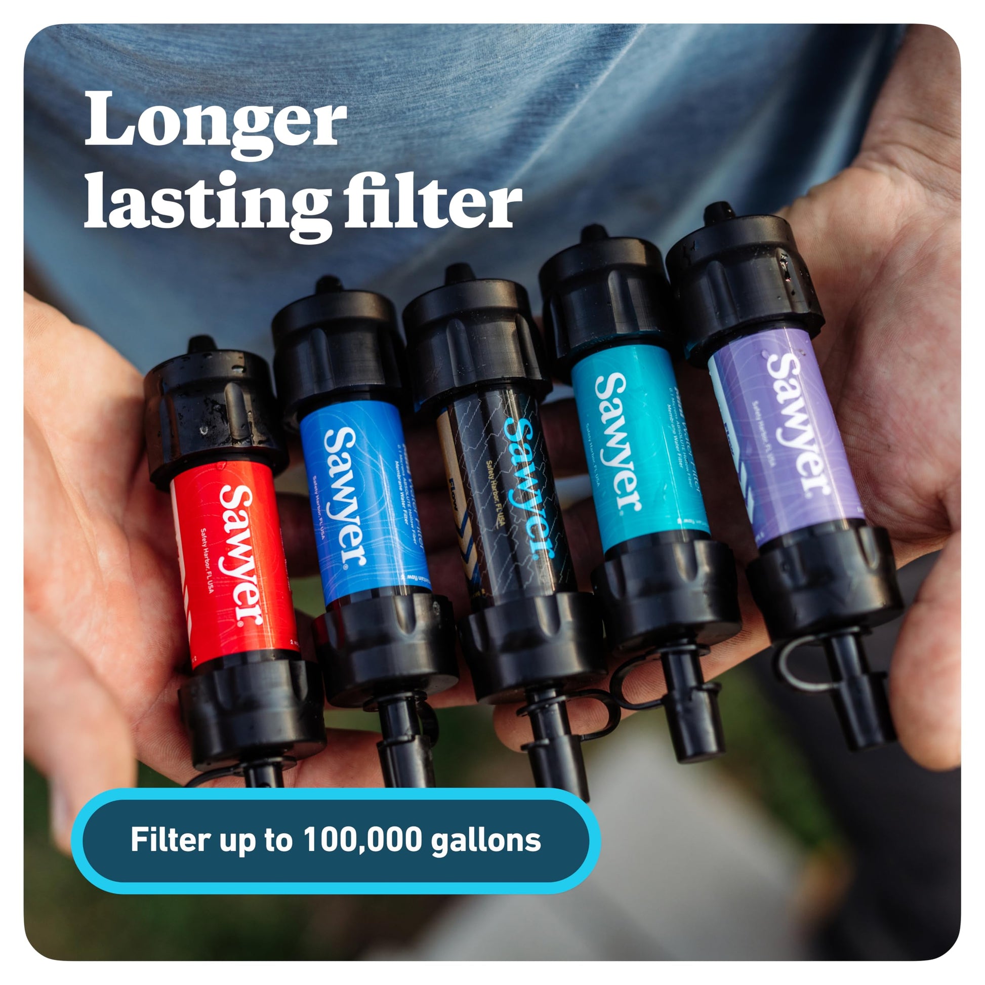Filter rated up to 100,000 gallons; Includes one Sawyer MINI filter, 16-ounce reusable squeeze pouch, 7-inch drinking straw, and cleaning plunger.