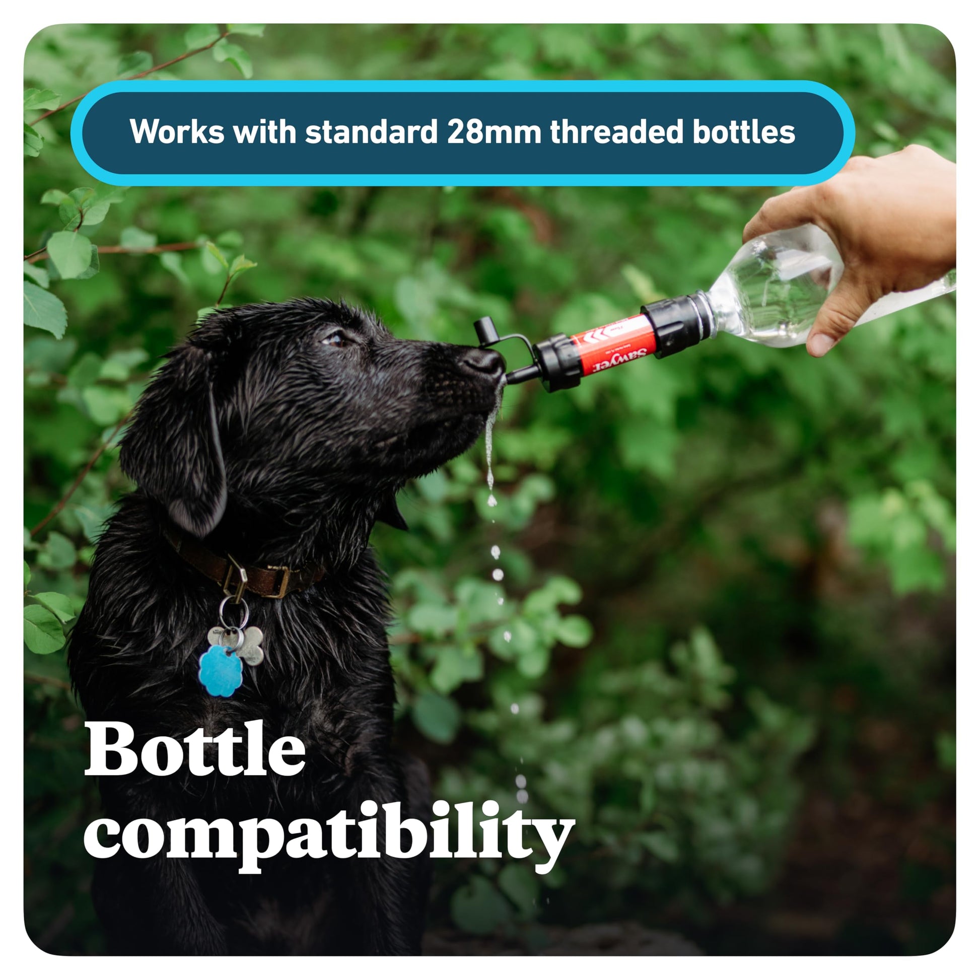 Attaches to included drinking pouch, standard 28 mm disposable water bottles, hydration packs, or use the straw to drink directly from your water source