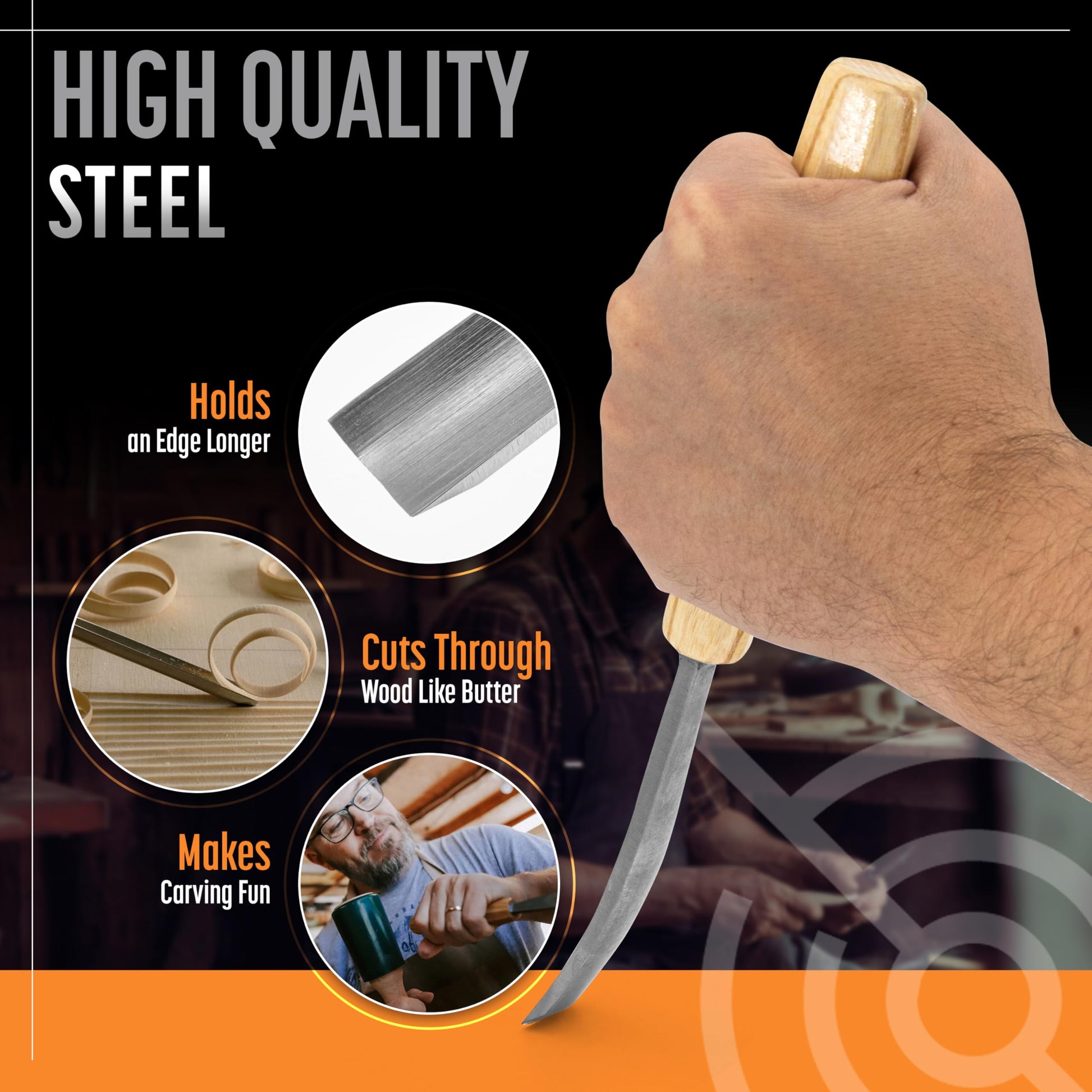 • Carve Longer – Our wood carving chisels are made from high-quality alloy chromium-vanadium steel and hardened to Rockwell C60, so blades will hold an edge for a long time and won't dull quickly with repeated use. Comparable to Swiss made carving tools in durability.